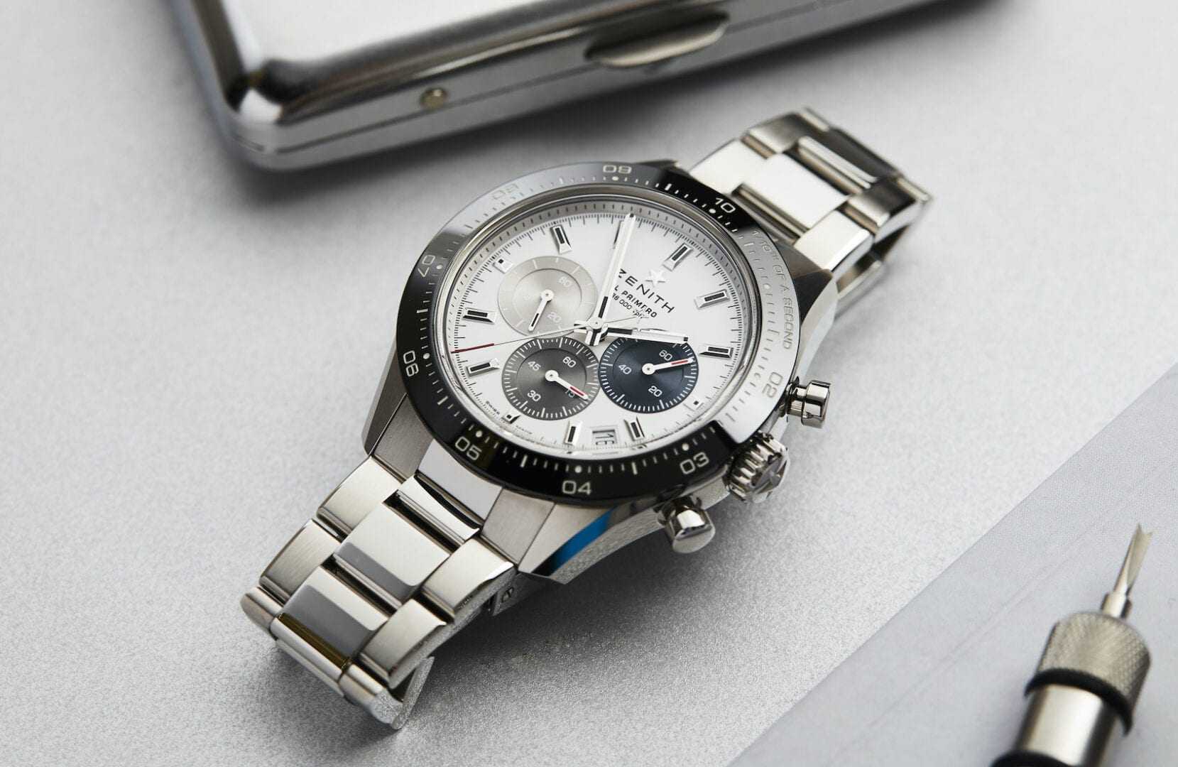 …μέσα του τον μηχανισμό El Primero 3600 με ακρίβεια 1/10 του δευτερολέπτου ενώ υπάρχει πίσω μέρος από ζαφείρι. Κατασκευή κορυφαία και επιλογή είτε ενός bracelet είτε ενός λουρακιού ελαστικού από Cordura.