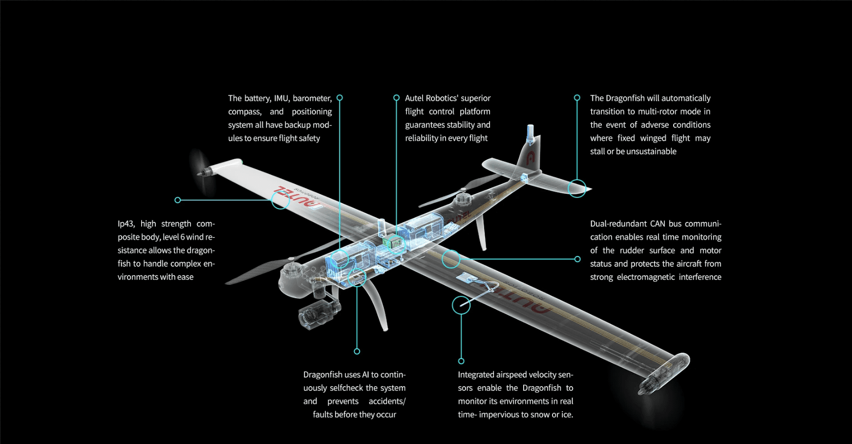 …tilt rotor σχεδιασμό που βοηθά, όπως λένε οι δημιουργοί να ‘λειτουργεί απλά κα χωρίς πολύπλοκο σχεδιασμό’ το εναέριο όχημα. Το dragonfish είναι σπονδυλωτό, αδιάβροχο “smart and reliable”. Το Dragonfish μάλιστα πετά “out of the box” και χρησιμοποιεί AI tracking δυνατότητες.