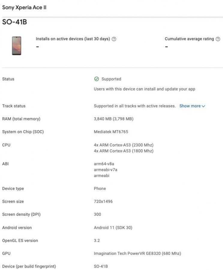 Το SO-41B smartphone θα εμφανιστεί με την ονομασία Xperia Ace II και μέσα έχει το Mediatek MT6765, δεν είναι 5G και έχει RAM 4GB. Ανάλυση 1496 x 720 pixel σε 19:9 λόγο πλευρών και με οθόνη 5” Full HD+.