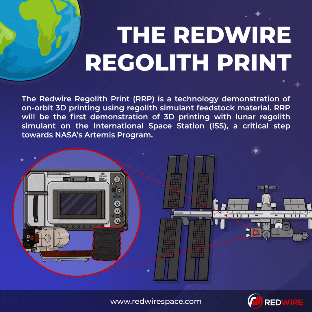 …υπηρεσία μιλά για το Redwire Regolith Print (RRP) project που ουσιαστικά μετατρέπει σκόνη που βρίσκεται στην Σελήνη σε στέρεα αντικείμενα. Το νέο μηχάνημα θα δουλεύψει μαζί με το σημερινό σύστημα εκτύπωσης στον ISS, το ManD, για να δοκιμάσει 3D printing ρεγόλιθου. Τα αποτελέσματα θα μελετηθουν και “could help determine the feasibility of regolith as a raw material and 3D printing as a technique for construction on future space missions,” όπως λέει ο λογαριασμός twitter του ISS Research.