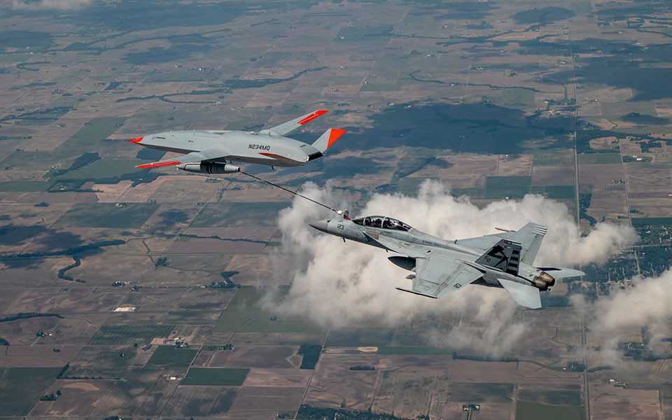 …επίδειξη ενός Μη Επανδρωμένου Αεροσκάφους να ανεφοδιάζει ένα άλλο αεροσκάφος. Μετά από ένα F/A-18 Super Hornet ένα E-2D Hawkeye αεροσκάφος Εναέριου Ελέγχου ‘συναντήθηκε’ με ένα MQ-25 Stingray drone και συνδέθηκε.