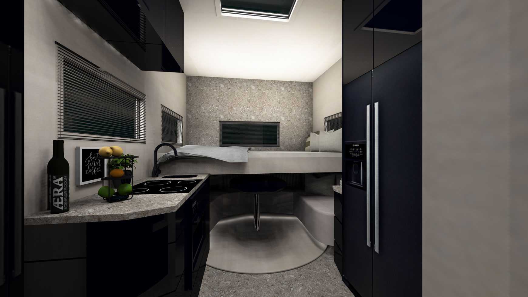 Υπάρχουν ακόμη και σχάρες για τους εφεδρικούς τροχούς του ATV ενώ εσωτερικά, τέσσερα άτομα μπορούν να μείνουν σε ένα luxury περιβάλλον που έχει και κουζίνα και τραπεζαρία με u-σχήμα αλλά και μπάνιο, ντουζιέρα. Τα πατώματα είναι θερμαινόμενα, υπάρχουν πάνελ ηλιακά για 840 και ένα 400-Ah/24-V ιόντων λιθίου battery pack.