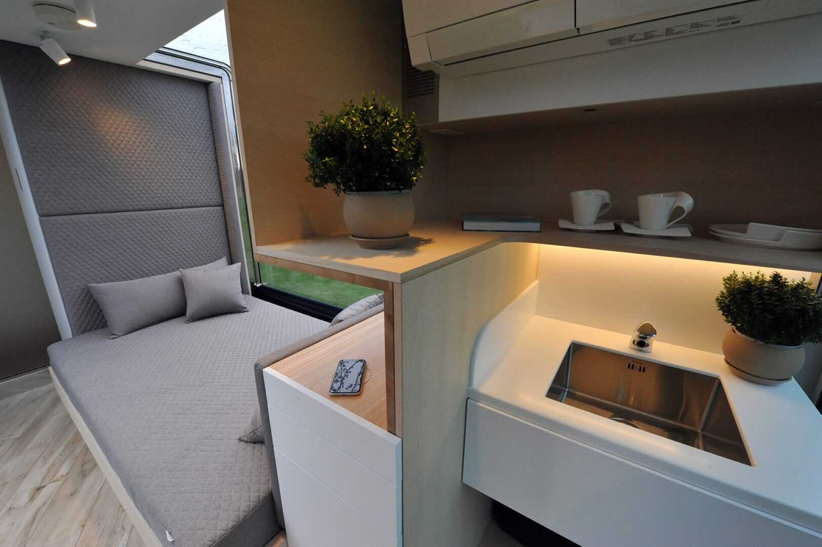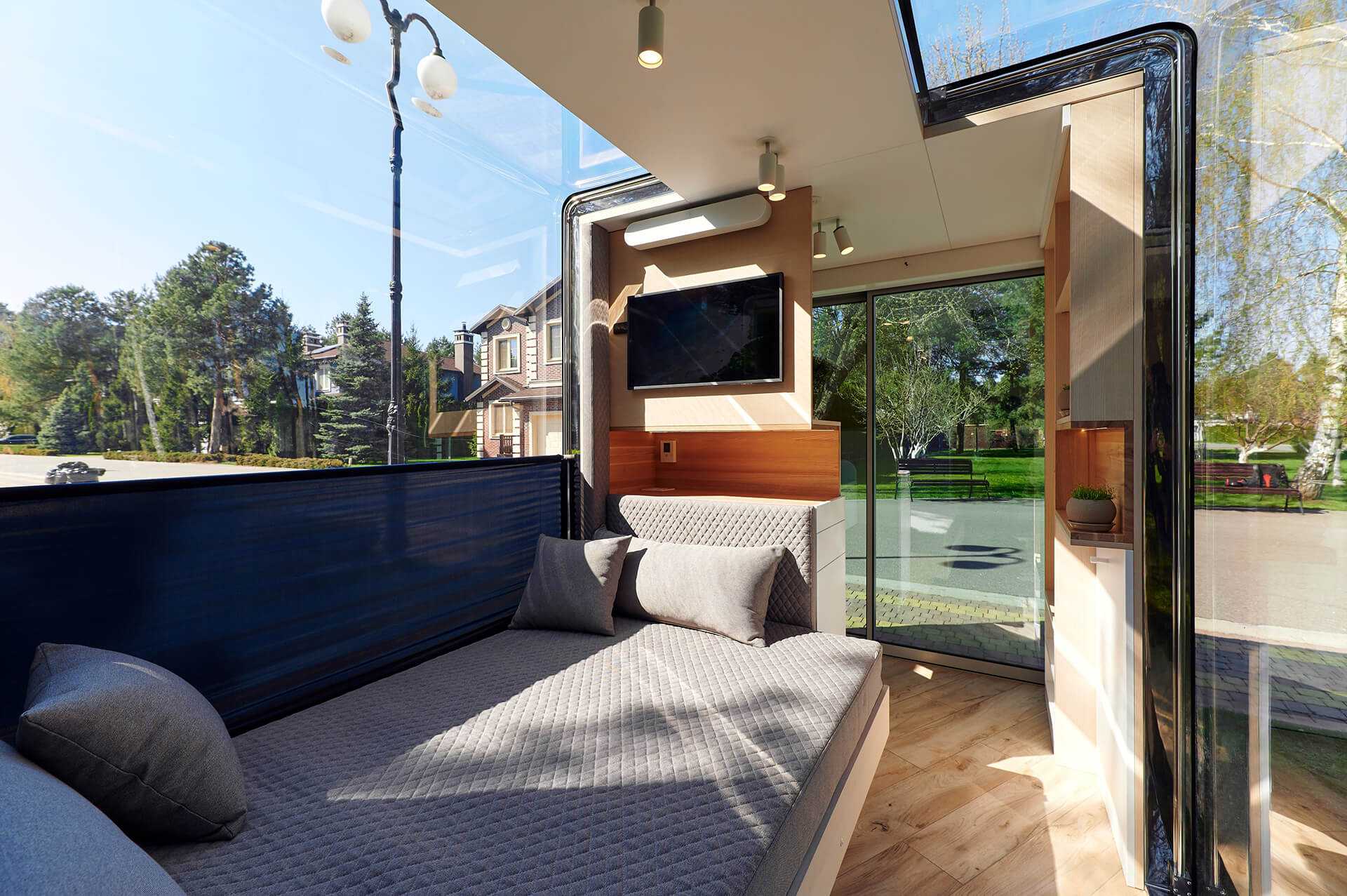Η συνθετική δομή του έχει σαν βάση 3D-εκτυπωμένα στοιχεία από fiberglass και βαμμένο ατσάλι ενώ σχεδιαστικά έχει πάρει στοιχεία από τον κόσμο των γιότ. Πόσο μεγάλο; Δίνει 11 τ.μ που έχουν διαχωριστεί σε ένα μικρό ‘kitchenette’ κουζινάκι, ένα υπνοδωμάτια και ένα μπάνιο.