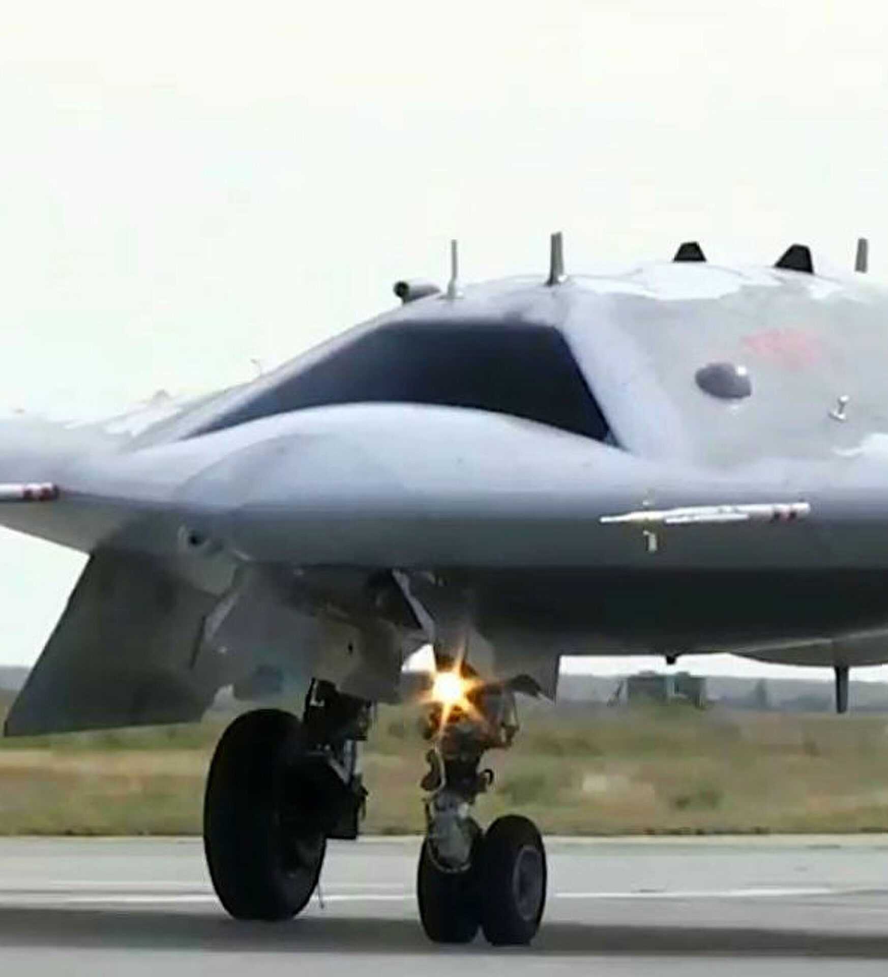 …Sukhoi S-70 Okhotnik drone μάχης της από την γραμμή κατασκευής. Φαίνεται μάλιστα πως -σε σύμμορφωση με τις απαιτήσεις για stealth, το nozzle, το ακροφύσιο δηλαδή θα είναι επίπεδο και άρα stealthy.