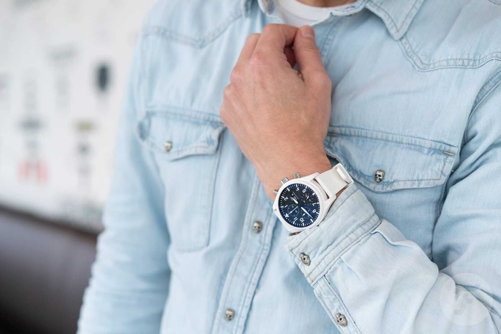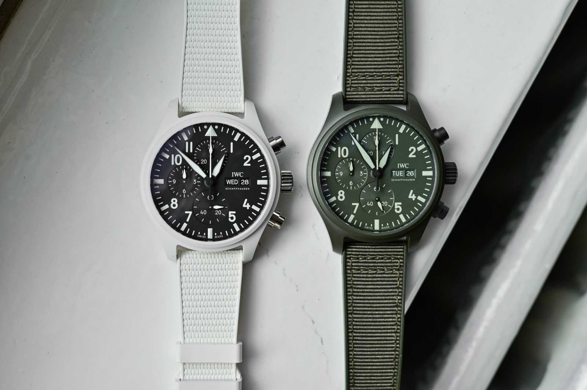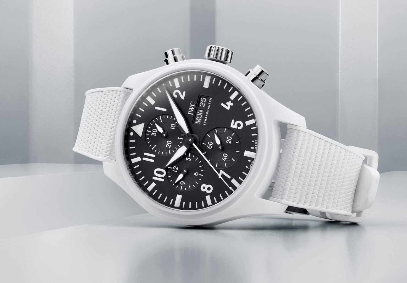 …και τιμά τα βουνά Sierra Nevada Mountains, τις περιοχές όπου οι πιλότοι του US Navy εκτελούν εκπαιδευτικές πτήσεις. Οι λευκές τους στολές, οι δείκτες, το τιτάνιο στο πίσω κάλυμμα, και το Top Gun logo κάνουν το ρολόι εκλεκτό. Μέσα, ο κατασκευασμένος από την IWC μηχανισμός 69380 και για το χέρι, ένα λευκό λουράκι.