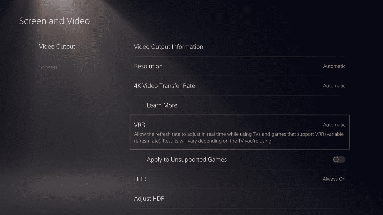Η λειτουργία VRR θα είναι εφαρμόσιμη στα παιχνίδια Astro’s Playroom, Call of Duty: Vanguard, Call of Duty: Black Ops Cold War, Deathloop, Destiny 2, Devil May Cry 5 Special Edition, DIRT 5, Godfall, Marvel’s Spider-Man Remastered, Marvel’s Spider-Man: Miles Morales, Ratchet & Clank: Rift Apart, Resident Evil Village, Tiny Tina’s Wonderlands, Tom Clancy’s Rainbow Six Siege and Tribes of Midgard.