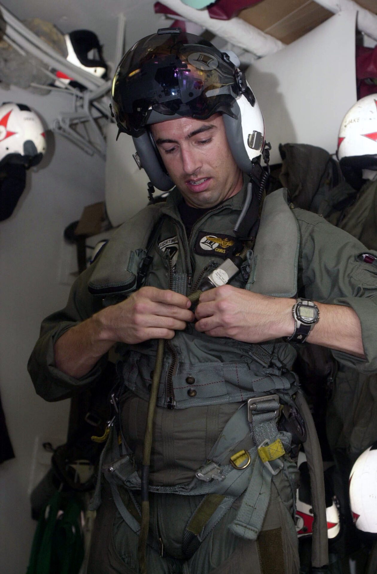 The Arabian Gulf (Jun. 17, 2003) — Lt. Christopher Papaioanu assigned to the ÒTop HattersÓ of Strike Fighter Squadron Fourteen (VFA-14) removes his flight gear in the paraloft aboard USS Nimitz (CVN 68). Nimitz Carrier Strike Force and Carrier Air Wing Eleven (CVW-11) are deployed in support of Operation Iraqi Freedom. Operation Iraqi Freedom is the multi-national coalition effort to liberate the Iraqi people, eliminate IraqÕs weapons of mass destruction, and end the regime of Saddam Hussein. U.S. Navy photo by PhotographerÕs Mate 3rd Class Yesenia Rosas.