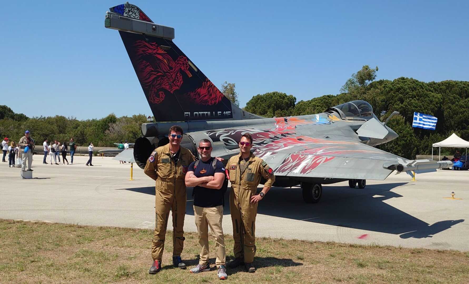 …Μοίρας Escadron de Chasse 3/30 της Πολεμικής Αεροπορίας της Γαλλίας που έχουν ξεχυθεί στον χώρο, κοιτώντας δύο μαχητικά να εκτελούν με εκκωφαντικό βρόντο μια συντονισμένη εναέρια κλειστή περιστροφή στον ελληνικό ουρανό. Την ίδια ώρα, δεκάδες άνδρες και γυναίκες με ξεχωριστές ναυτικού χρώματος στολές, το τεχνικό προσωπικό της Μοίρας του Γαλλικού Ναυτικού, κοιτούν περήφανοι τους συναδέλφους τους που σκίζουν τον αέρα. Το κοινό χειροκροτά καθώς το γαλλικό «Top Gun» πρόγραμμα επίδειξης έχει ξεκινήσει.