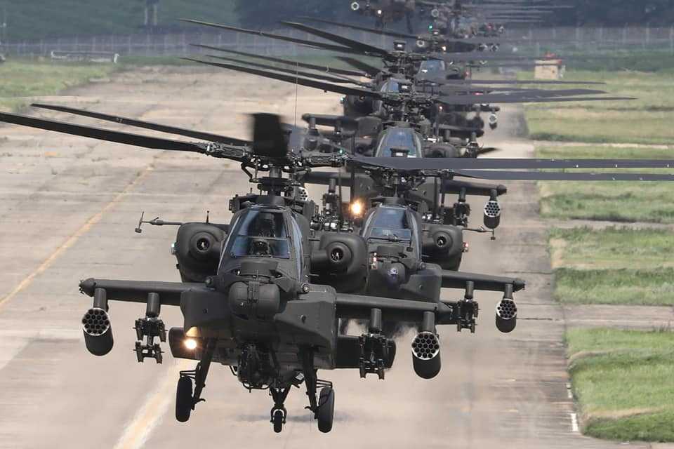 Ένας μεγάλος αριθμός από AH-64E Apache Guardian, CH-47D Chinook και UH-60P Black Hawk σε σχηματισμό στο έδαφος αλλά και στον αέρα.