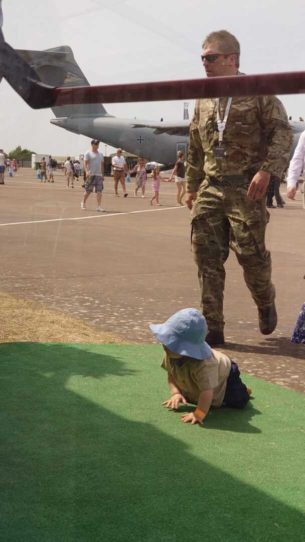 Την ώρα που η συζήτησή μας προχωρά, δίπλα μας ένας ατίθασος… νεαρός, το πολύ ενός έτους, κάνει τα πρώτα του βήματα με τη μητέρα του, που έχει έρθει στο αεροπορικό σόου για να δει έναν συγγενή της, Ιπτάμενο Πολεμικής Αεροπορίας που συμμετέχει στο RIAT 2022.