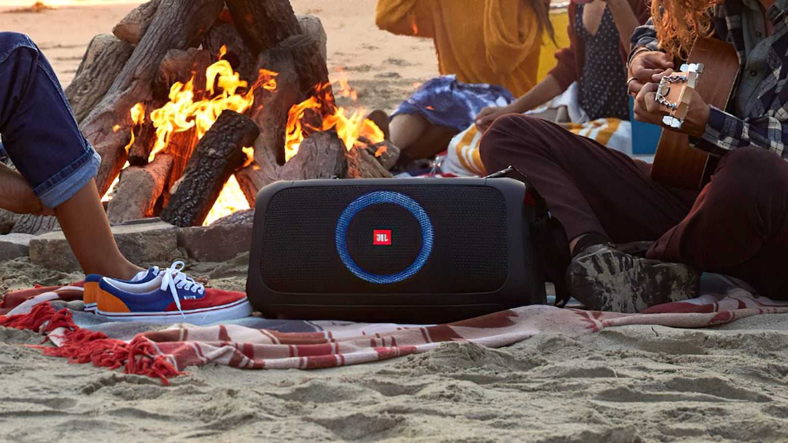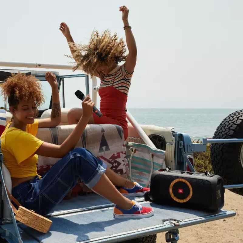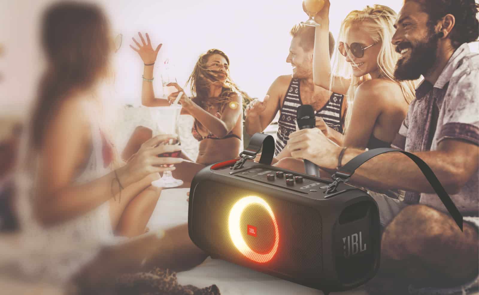 Το JBL PartyBox On-The-Go: “lets you see, hear and feel the beat. Turn it up loud with 100 watts of powerful JBL Pro Sound, synched to a dazzling light show. Access your favorite tunes with Bluetooth, USB, AUX and TWS (True Wireless Stereo) connectivity, grab a friend and sing your hearts out with the JBL wireless mics, or use the instrument input to play along. With a bottle opener, padded shoulder strap, rechargeable battery and IPX4 splash-proof protection, the JBL PartyBox On-The-Go has everything you need to get the party started—and take it with you”.