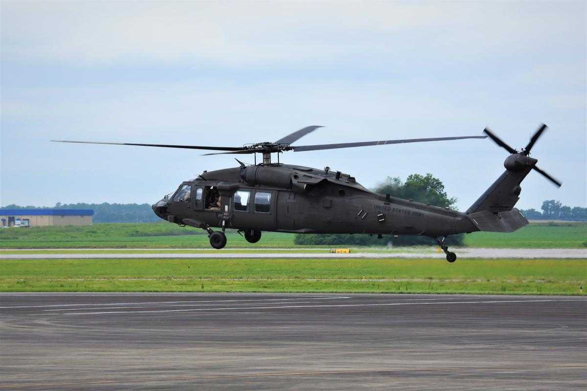 A UH-60V Black Hawk hovers during a demonstration flight at the Huntsville, Al. International Airport July 13, 2021. (Nathaniel Letson/US Army)