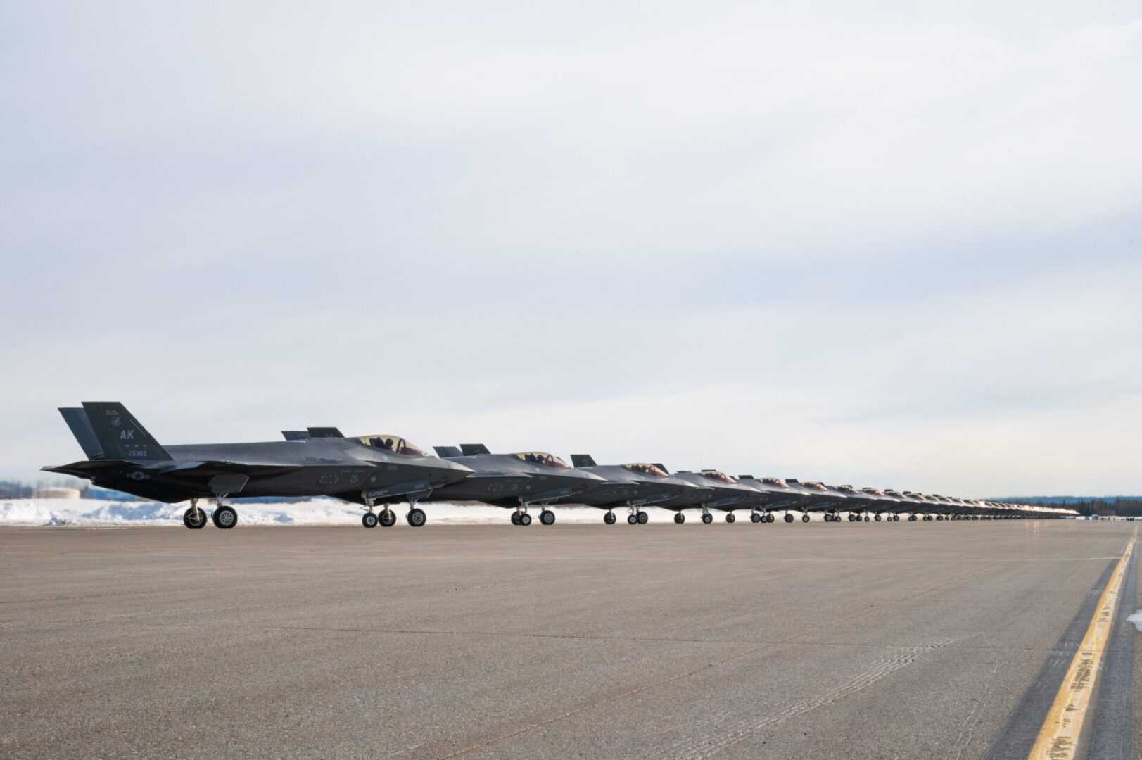 A formation of 42 F-35A Lightning II’s, 354th Fighter Wing, during a routine readiness exercise at Eielson Air Force Base, Alaska, March 25, 2022. The capabilities demonstration represents the culmination of the dedicated efforts of the 354th Fighter Wing, with each Airman providing vital contributions to ensure Team Eielson is ready to deliver airpower anytime, anywhere. (U.S. Air Force photo by Airman 1st Class Jose Miguel T. Tamondong)