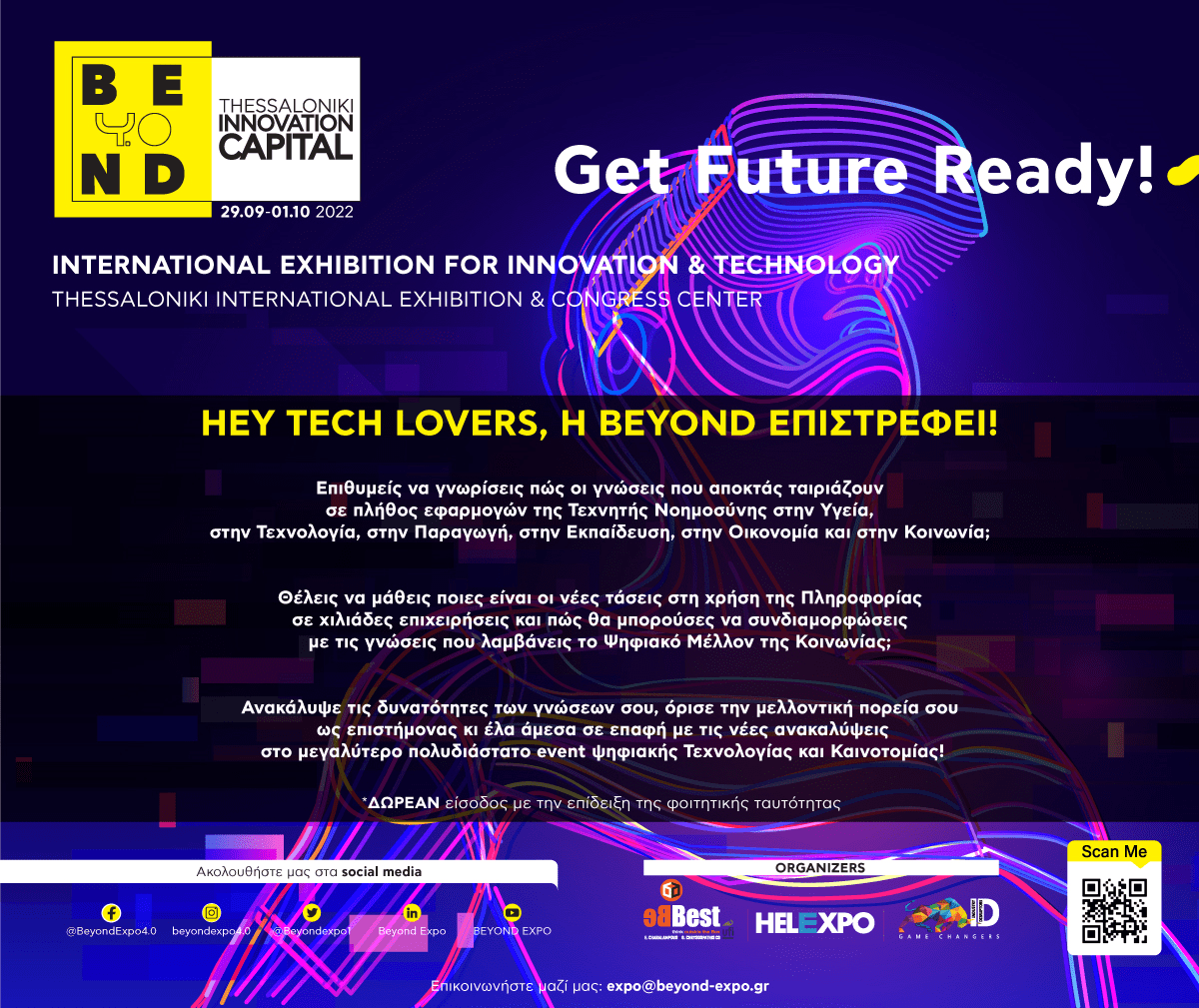 Η Έκθεση BEYOND ανοίγει τις πύλες της αύριο, Πέμπτη 29 Σεπτεμβρίου 2022, στους χώρους της ΔΕΘ και θα διαρκέσει μέχρι και το Σάββατο 1 Οκτωβρίου 2022. Η είσοδος για τις φοιτήτριες και τους φοιτητές του ΑΠΘ είναι ελεύθερη (με την επίδειξη της φοιτητικής τους ταυτότητας). Ώρες λειτουργίας: Πέμπτη & Παρασκευή 10:00-20:00, Σάββατο 10:00-18:00.