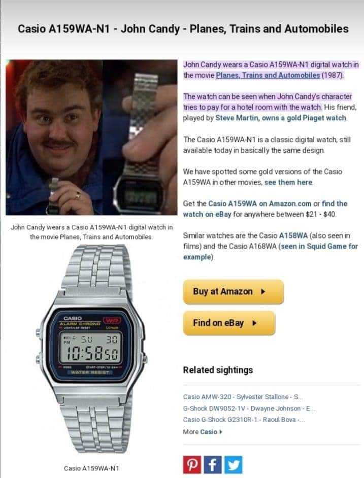 …εμφανίστηκε στην αγαπημένη ταινία “Planes, Trains & Automobiles”. Το ενδιαφέρον είναι πως το Casio Α159WA παράγεται ακόμη και σήμερα και είναι διαθέσιμο σε μια εξωφρενικά μικρή τιμή στην αγορά.