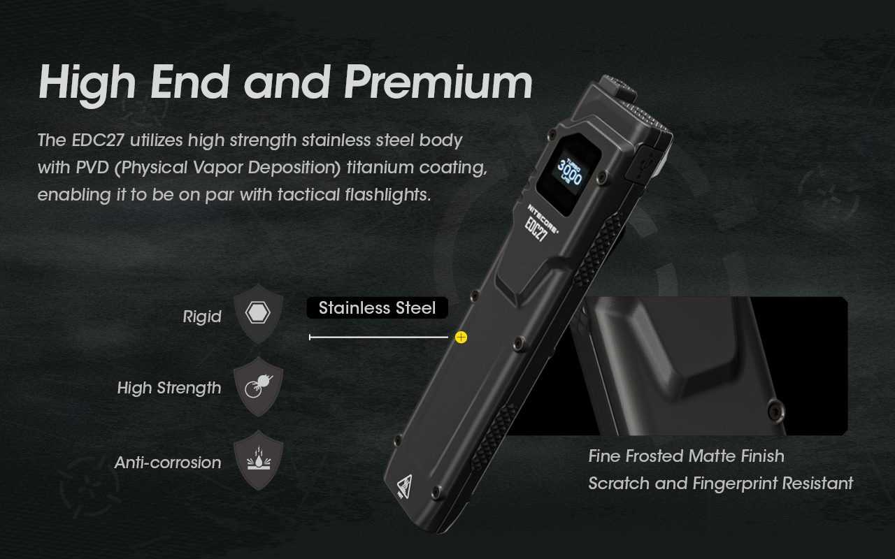 Το EDC27 είναι φτιαγμένο με επίστρωση PVD τιτανίου ενώ έχει και OLED οθόνη για αντοχή, brightness level και μπαταρία.