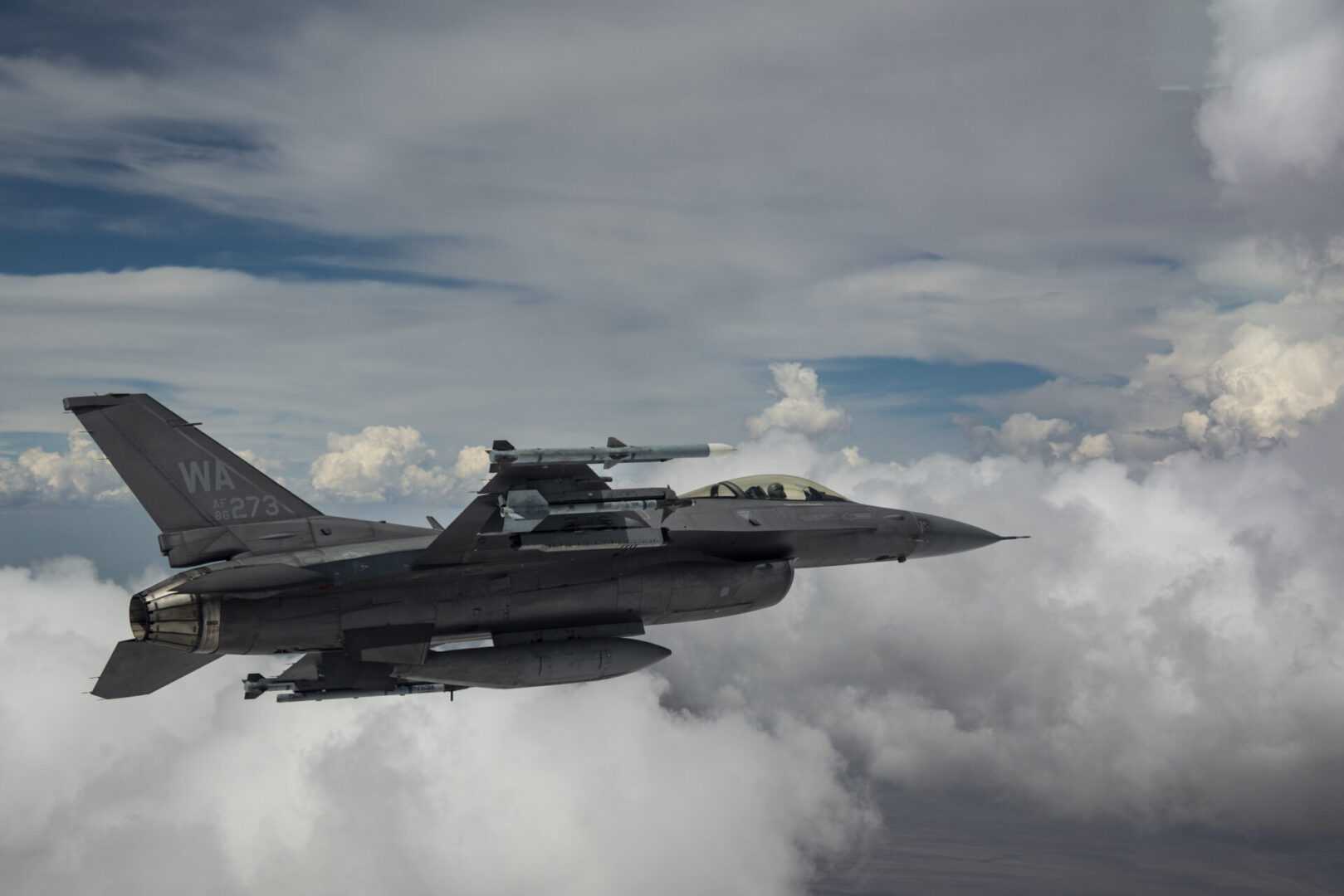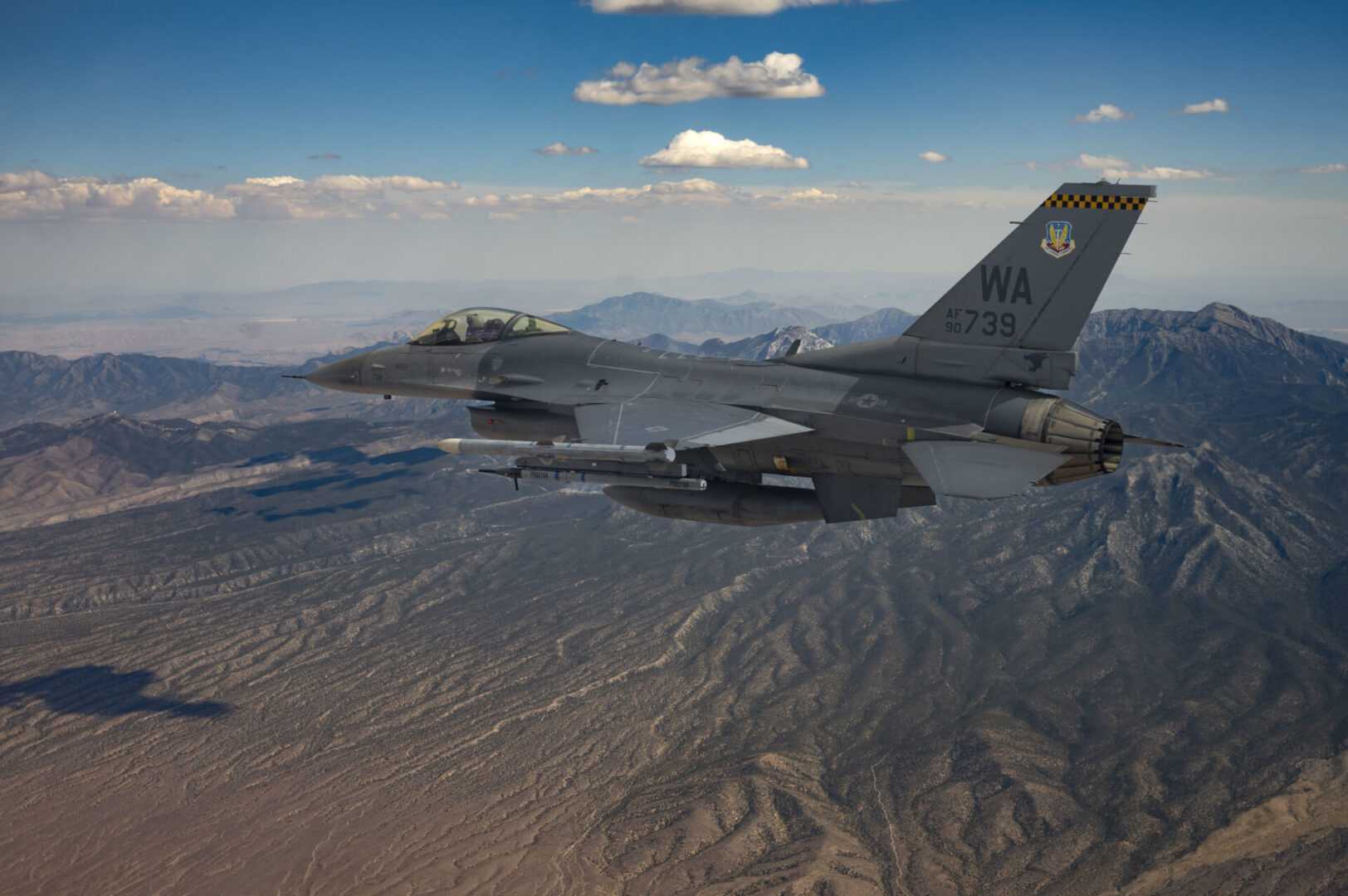 An F-16 Fighting Falcon piloted by Captain Tim “REEF” Joubert, instructor pilot assigned to the 64th Aggressor Squadron, flies over the Nevada Test and Training Range after participating in a Red Flag-Nellis 22-3 mission at Nellis Air Force Base, July 12, 2022. The Nevada Test and Training Range is the U.S. Air Force’s premier military training area with more that 12,000 square miles of air space and 2.9 million acres of land. (U.S. Air Force photo by Senior Airman Zachary Rufus)