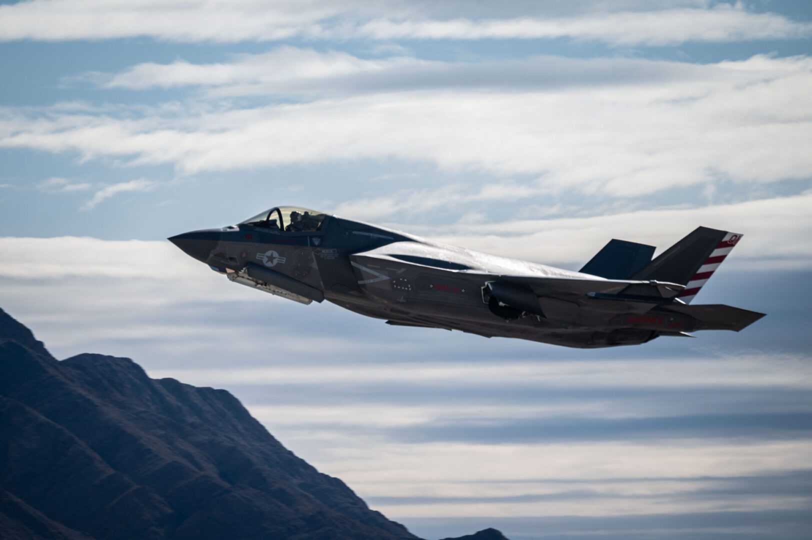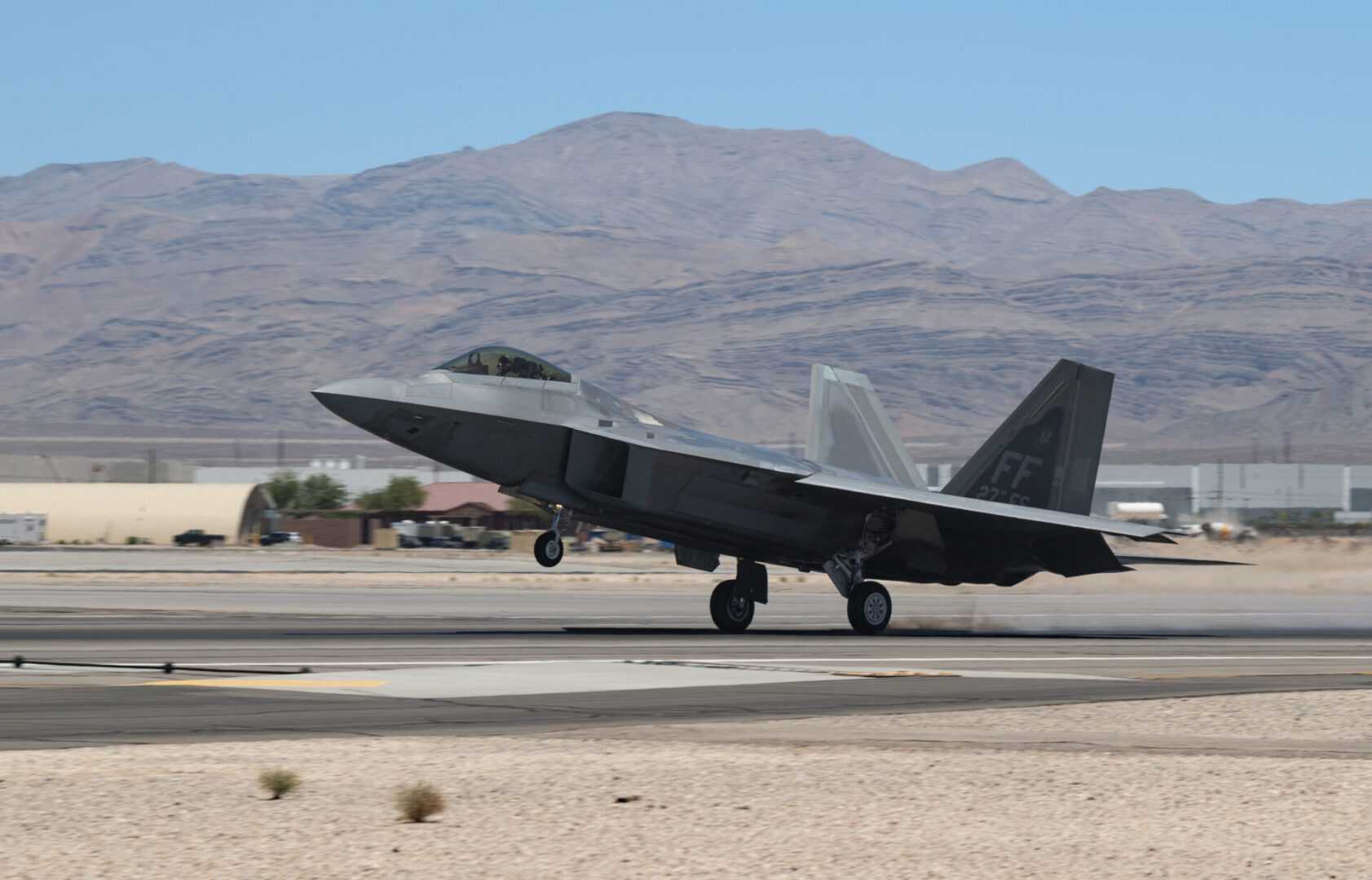 An F-22 Raptor assigned to Joint Base Langley-Eustis, Virginia arrives for Red Flag-Nellis 22-3 at Nellis Air Force Base, Nevada, July 6, 2022. Red Flag provides realistic combat training that saves lives while increasing combat effectiveness. (U.S. Air Force photo by William R. Lewis)