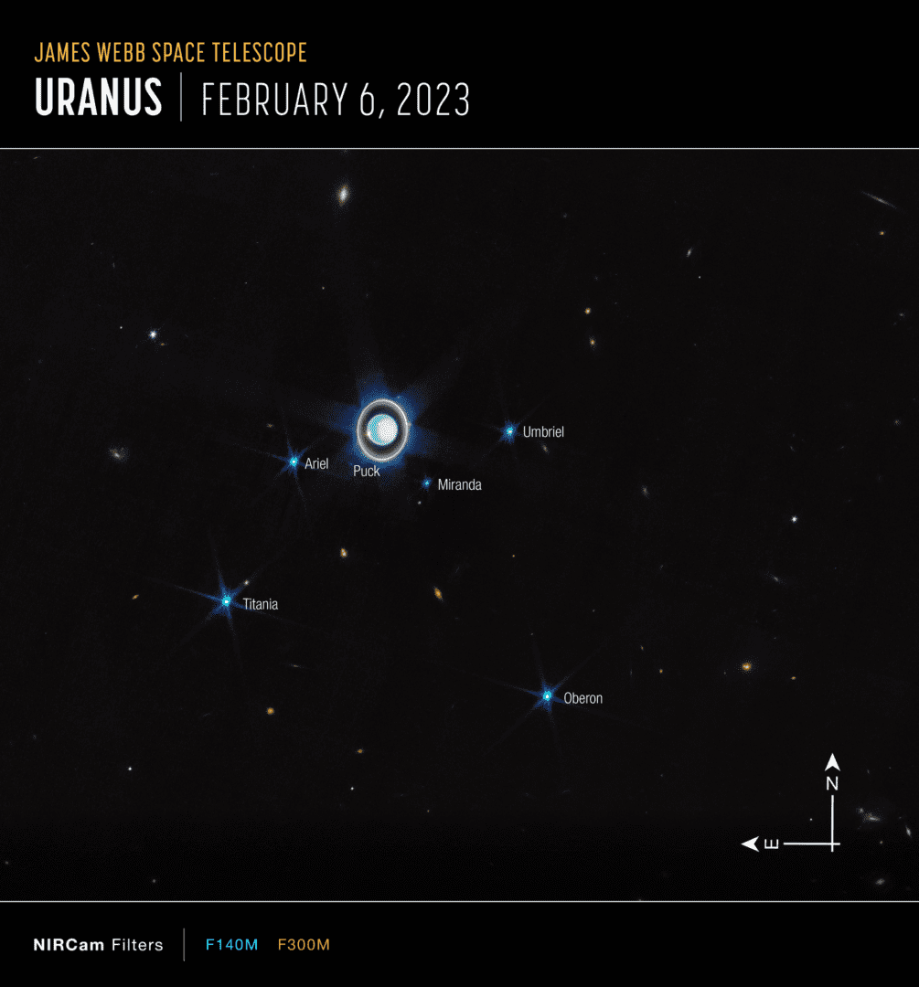 This wider view of the Uranian system with Webb’s NIRCam instrument features the planet Uranus as well as six of its 27 known moons (most of which are too small and faint to be seen in this short exposure). A handful of background objects, including many galaxies, are also seen.