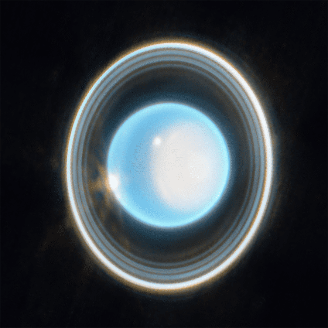 This wider view of the Uranian system with Webb’s NIRCam instrument features the planet Uranus as well as six of its 27 known moons (most of which are too small and faint to be seen in this short exposure). A handful of background objects, including many galaxies, are also seen.