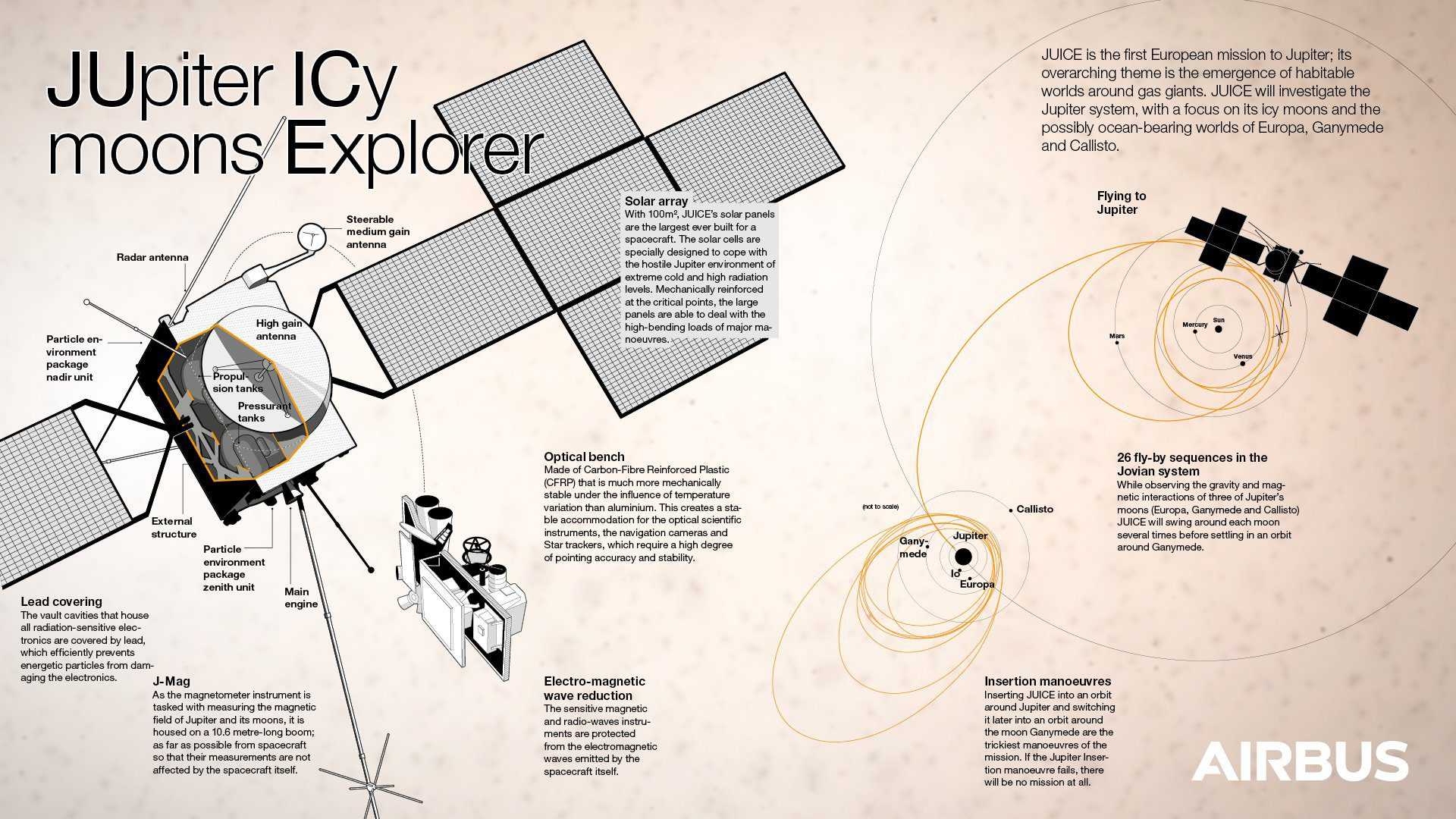 …οκτώ χρόνια υπολογίζεται πως θα έχει φτάσει στον προορισμό της στο βαθύ διάστημα. Η “Juice” θα εστιάσει ιδιαίτερα στην Ευρώπη, την Καλλιστώ και ειδικά τον Γανυμήδη, τρία φεγγάρια που είναι σε τροχιά στον Δία.