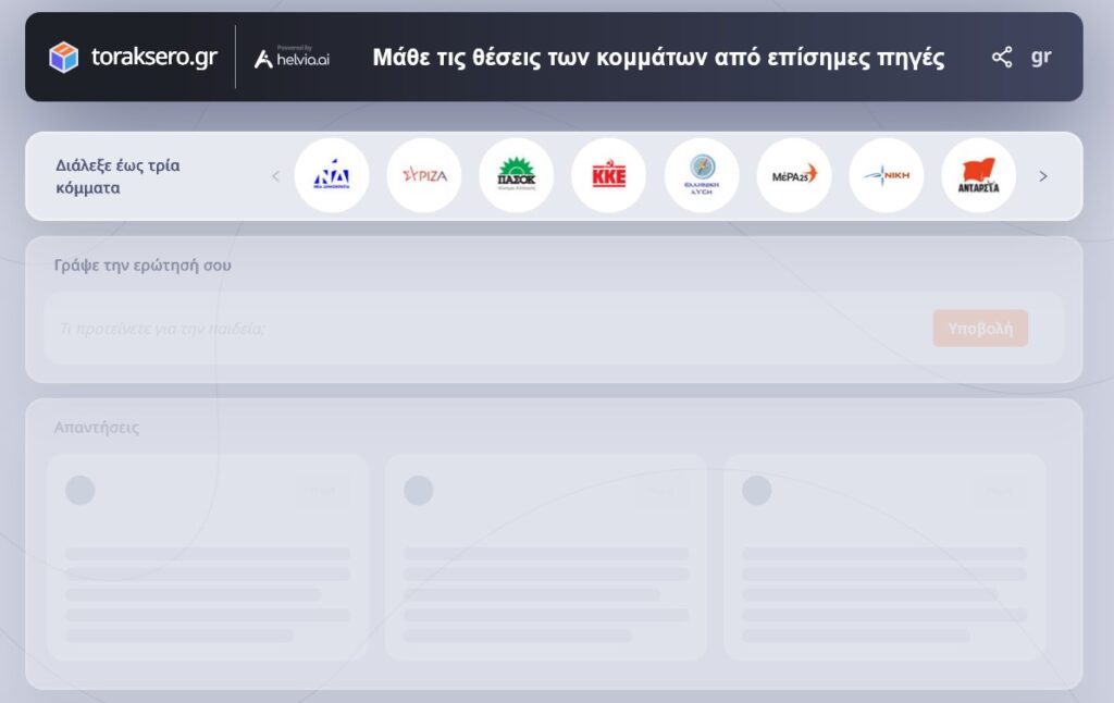 Με αυτόν τον στόχο, μια ομάδα επιστημόνων έστησε ένα εργαλείο με την επωνυμία toraksero.gr, έναν «ΑΙ βοηθό για τα προγράμματα των κομμάτων που με μερικά “ κλικ” δημιουργεί ένα ψηφιακό debate των θέσεων των κομμάτων που θα συναντήσει ο ψηφοφόρος στο παραβάν πίσω από την κάλπη» εξήγησε, μιλώντας στον ραδιοφωνικό σταθμό του ΑΠΕ-ΜΠΕ «Πρακτορείο 104.9FM» ο Σταύρος Βάσσος, ειδικός στην Τεχνητή Νοημοσύνη με περισσότερα από 20 χρόνια εμπειρίας στον ακαδημαϊκό χώρο, την έρευνα και το ΑΙ.