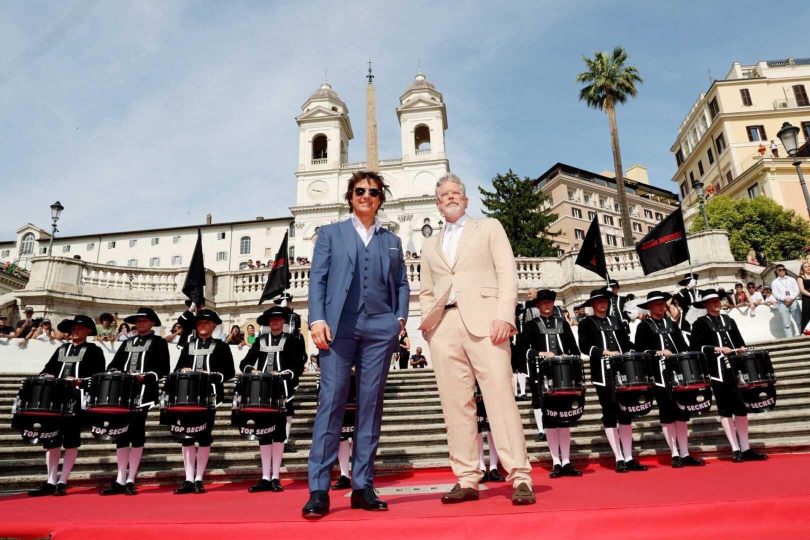 ROME, ITALY – JUNE 19: Top Secret Drum Corps, Tom Cruise and Christopher McQuarrie attend the Red Carpet at the Global Premiere of “Mission: Impossible – Dead Reckoning Part One” presented by Paramount Pictures and Skydance at The Spanish Steps on June 19, 2023 in Rome, Italy. (Photo by Vittorio Zunino Celotto/Getty Images for Paramount Pictures)