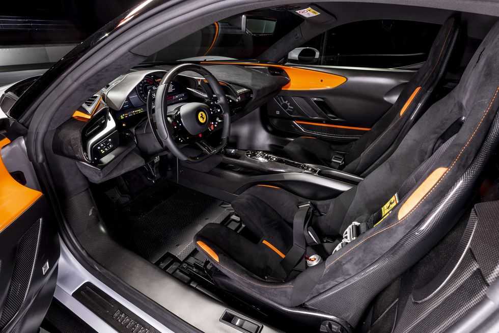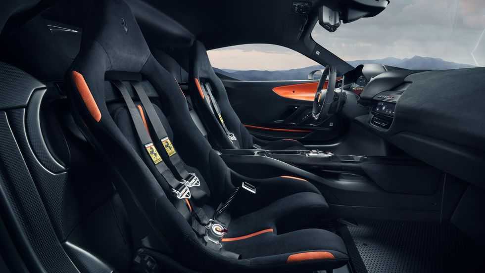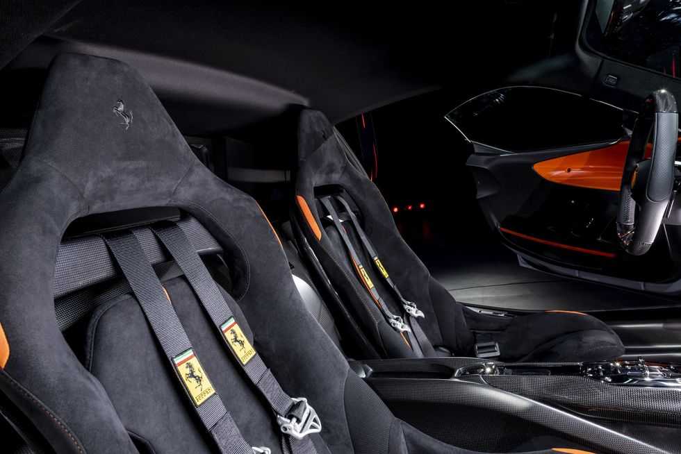 Η Ferrari έχει αφαιρέσει τις επενδύσεις και φτιάξει νέα monocoque bucket καθίσματα από carbon ενώ και η κεντρική κονσόλα έχει λιγότερα υλικά και φινίρισμα πάλι από carbon fiber.