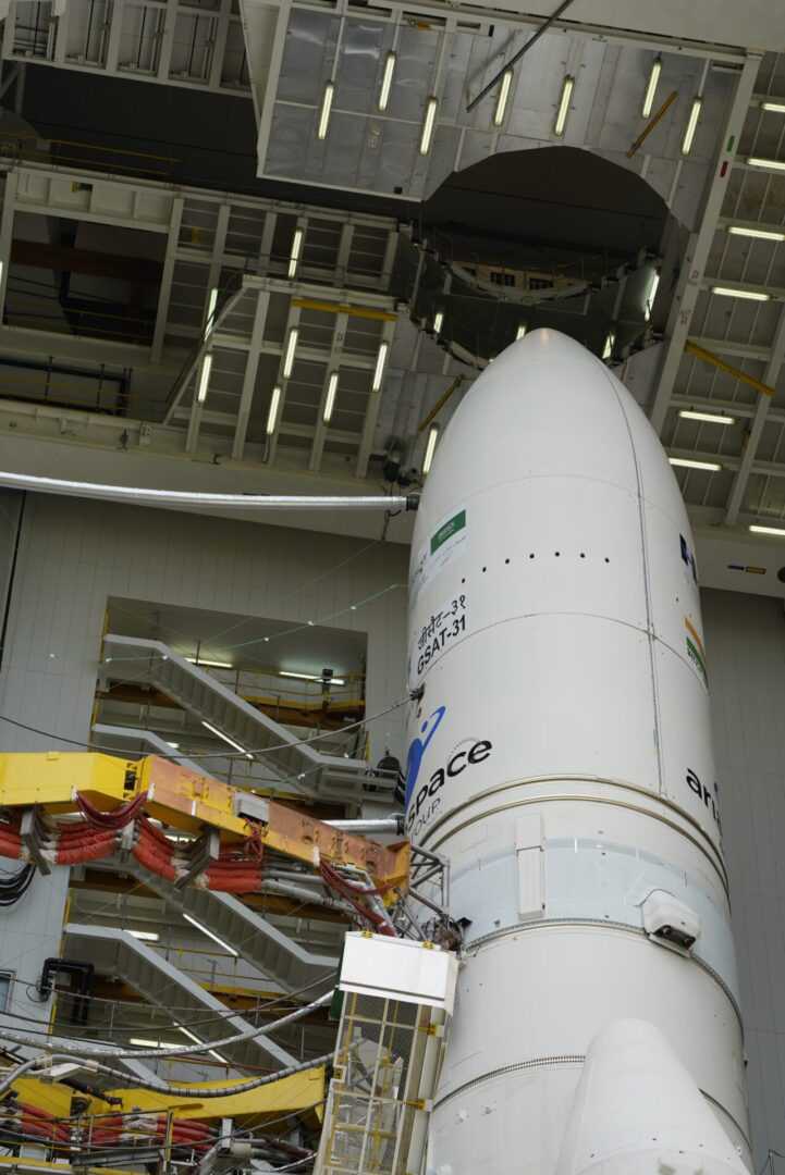Ένα πανύψηλο λευκό κυλινδρικό κατασκεύασμα με μια αιχμηρή άκρη στέκεται στο βάθος της καταπράσινης όασης που κυκλώνεται από τροπική βλάστηση τόσο πυκνή που κρύβει το φως ακόμη και μέσα στο καταμεσήμερο. Πλησιάζουμε πιο κοντά και περνούμε το τελευταίο σημείο ελέγχου, ενώ στο βάθος του ορίζοντα ο πύραυλος αποκαλύπτεται μέσα από ένα άνοιγμα των γιγάντιων θυρών του ειδικού κτιρίου του διαστημικού κέντρου. Ο Ariane 5 μοιάζει να μην …ανησυχεί καθόλου ούτε από το μελίσσι των τεχνικών που βρίσκονται στην κορυφή δίπλα στα μυριάδες συστήματα και ελέγχουν τους δορυφόρους που έχει σφραγισμένους μέσα στη μύτη του, ούτε και από το γέμισμα των σπλάγχνων του με καύσιμα, μια εξαιρετικά κρίσιμη διαδικασία.