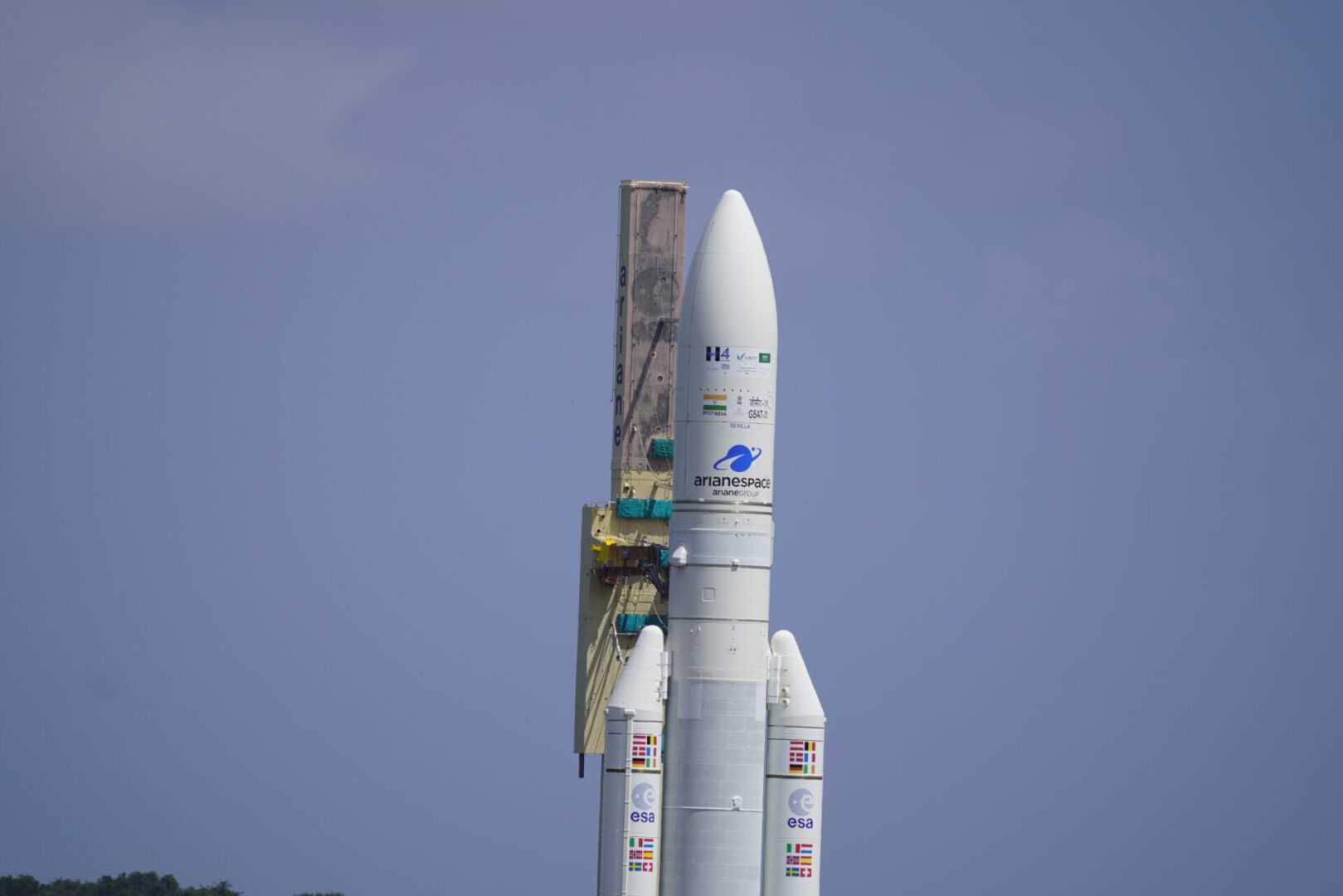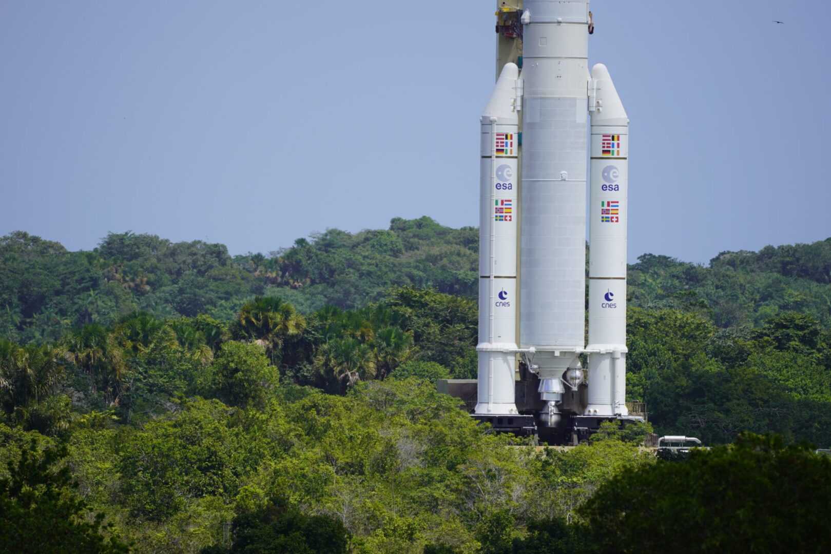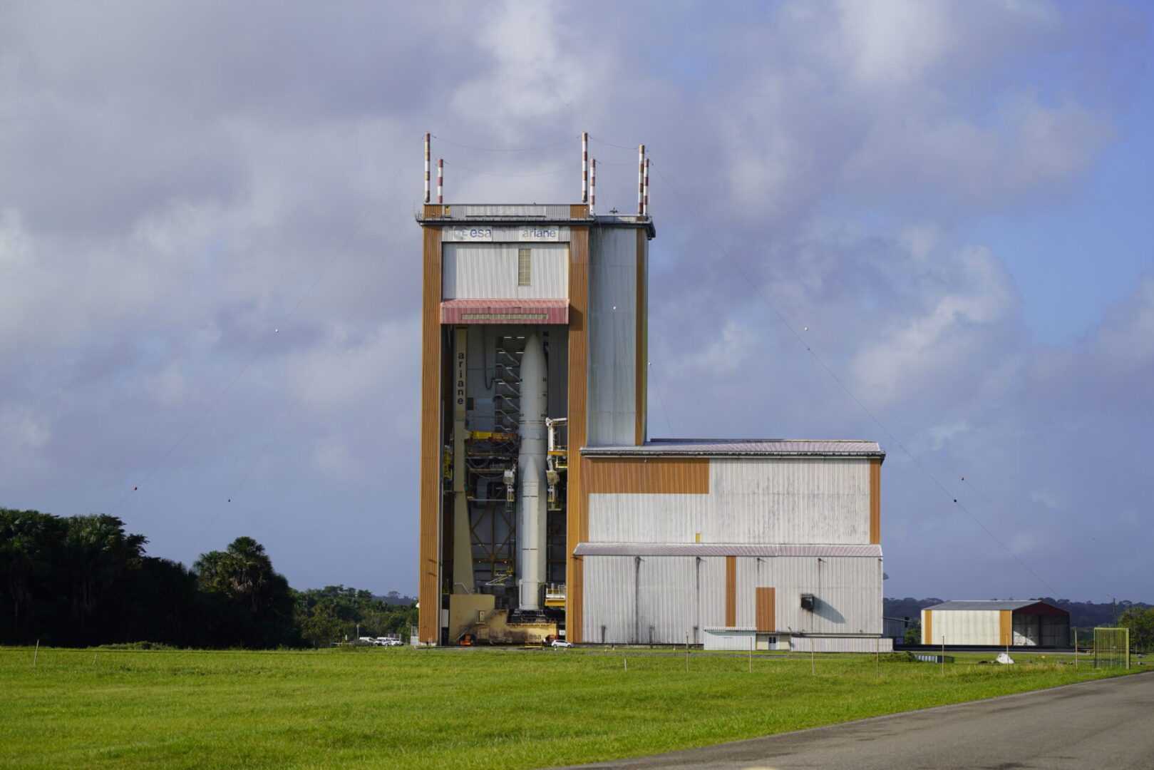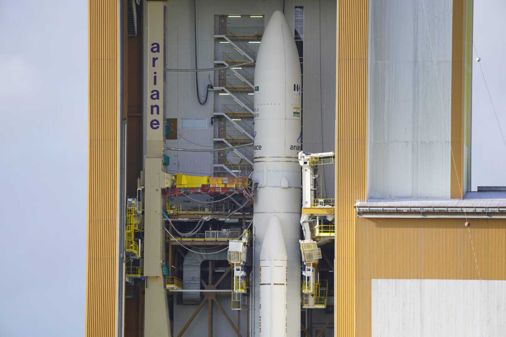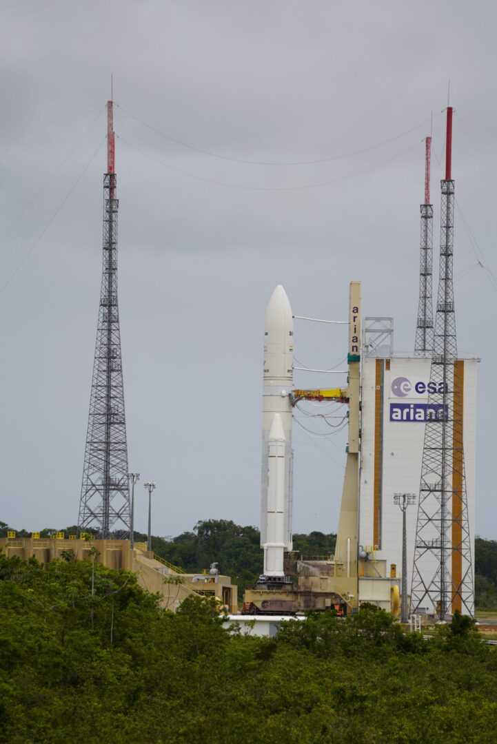 Ένα πανύψηλο λευκό κυλινδρικό κατασκεύασμα με μια αιχμηρή άκρη στέκεται στο βάθος της καταπράσινης όασης που κυκλώνεται από τροπική βλάστηση τόσο πυκνή που κρύβει το φως ακόμη και μέσα στο καταμεσήμερο. Πλησιάζουμε πιο κοντά και περνούμε το τελευταίο σημείο ελέγχου, ενώ στο βάθος του ορίζοντα ο πύραυλος αποκαλύπτεται μέσα από ένα άνοιγμα των γιγάντιων θυρών του ειδικού κτιρίου του διαστημικού κέντρου. Ο Ariane 5 μοιάζει να μην …ανησυχεί καθόλου ούτε από το μελίσσι των τεχνικών που βρίσκονται στην κορυφή δίπλα στα μυριάδες συστήματα και ελέγχουν τους δορυφόρους που έχει σφραγισμένους μέσα στη μύτη του, ούτε και από το γέμισμα των σπλάγχνων του με καύσιμα, μια εξαιρετικά κρίσιμη διαδικασία.