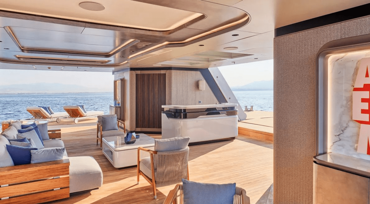 …ένα εσωτερικό που έχει σχεδιάσει το Studio Vafiadis και η Massari Design. Μπορεί να φιλοξενήσει έως 12 καλεσμένους σε 8 καμπίνες και έχει βγει ήδη στην αγορά για ενοικίαση