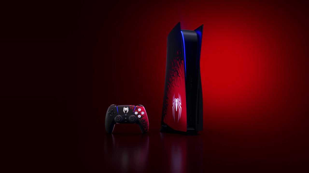 Το μαύρο PlayStation 5 έχει ‘χτυπηθεί’ από μια κόκκινη αράχνη και έχει ένα φωτεινό Spider-Man λογότυπο.