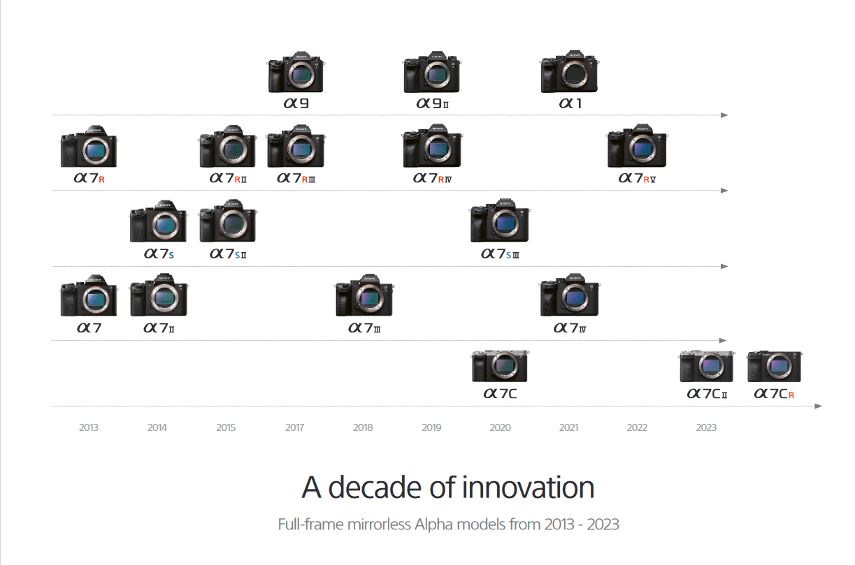 Τον Οκτώβριο του 2013 ανακοινώθηκε η κυκλοφορία των πρώτων φωτογραφικών μηχανών Alpha 7 και 7R. Είναι η εταιρία που άλλαξε σε μια δεκαετία τα πάντα στην φωτογραφία. Λογικό έτσι είναι η Sony να ανακοινώνει με υπερηφάνεια τον εορτασμό μιας ολόκληρης δεκαετίας καινοτομιών στον κόσμο της φωτογραφίας με την συμπλήρωση 10 ετών από την κυκλοφορία των φωτογραφικών μηχανών Alpha mirrorless και full-frame. Κατά την τελευταία δεκαετία, η Sony έχει επεκτείνει τα όρια της τεχνολογίας της φωτογραφίας, αναδιαμορφώνοντας τον κλάδο και παρέχοντας στους φωτογράφους και τους βιντεογράφους εργαλεία τελευταίας τεχνολογίας.