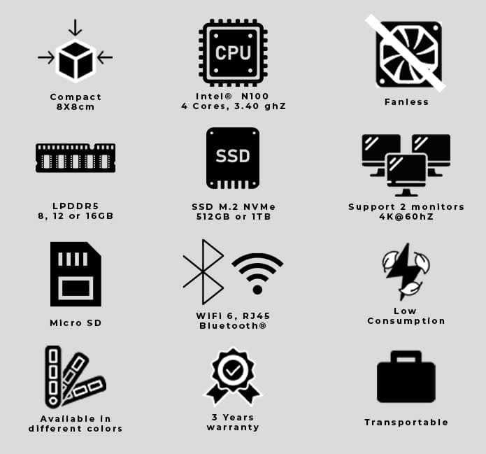 Διαστάσεις μόλις 8 x 8 εκατοστά (!) ώστε να το χαρακτηρίζει ως το “smallest fanless PC powered by the Intel N100 CPU in the world”.