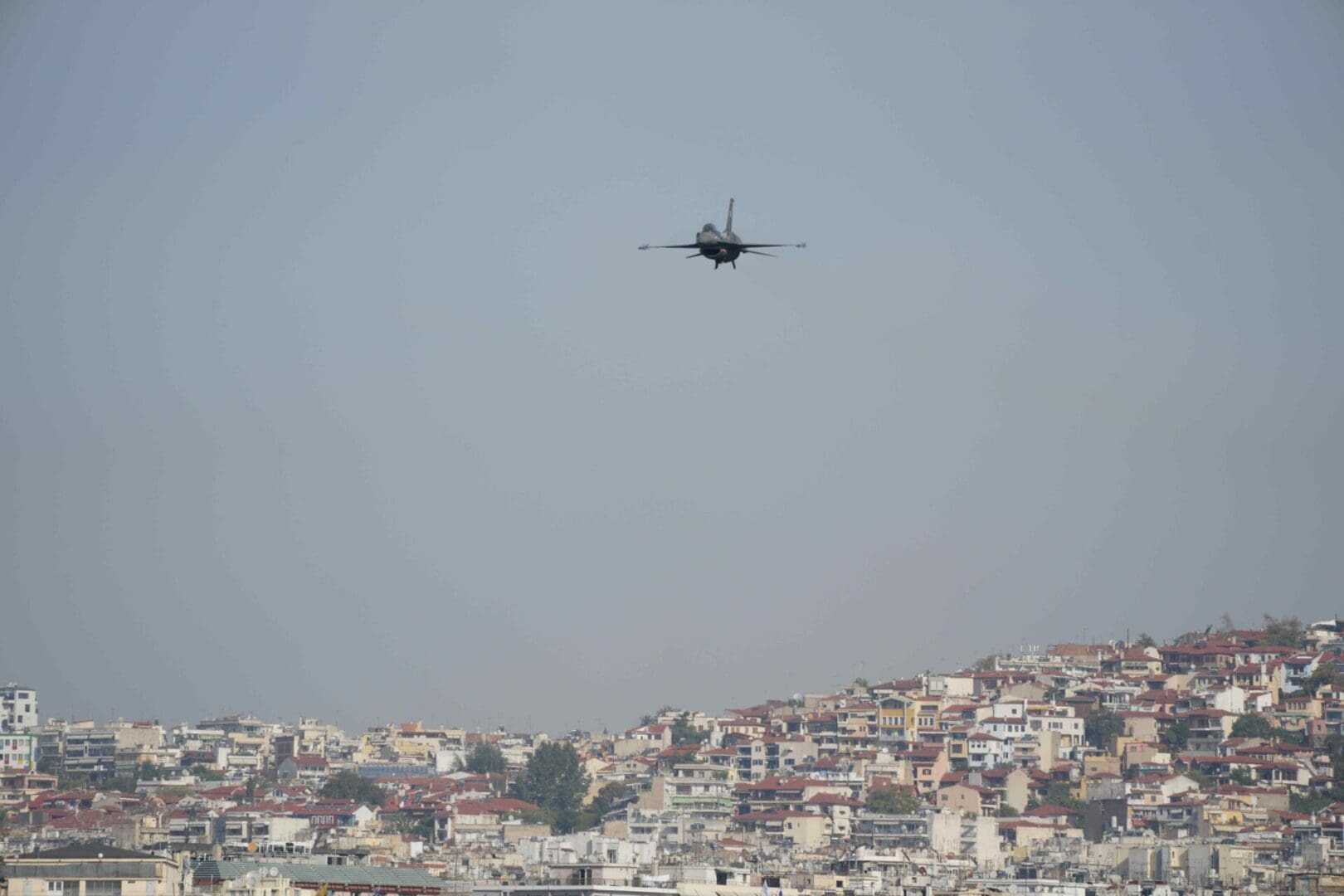 Στις 11:30 το πρωί ακριβώς, με μια δυναμική «βροντή» ο «Δίας» της Πολεμικής Αεροπορίας έσκισε κάθετα το παραλιακό μέτωπο πάνω από την εξέδρα που θα φιλοξενήσει τους επίσημους, οι οποίοι θα παραβρεθούν στην αυριανή στρατιωτική παρέλαση, πριν να εκτελέσει μια απότομη κατακόρυφη άνοδο πάνω από τον Θερμαϊκό Κόλπο.