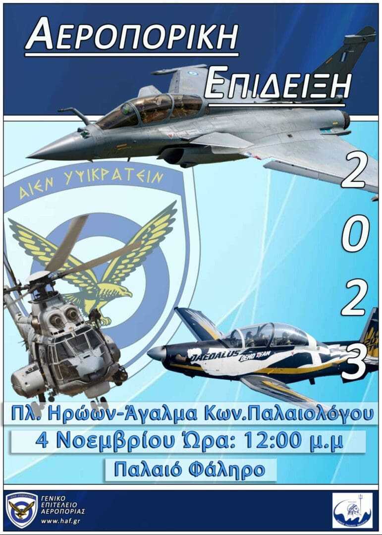 12:00: Φλοίσβος Παλαιού Φαλήρου: Αεροπορική επίδειξη με τη συμμετοχή όλων των τύπων των αεροσκαφών της ΠΑ καθώς και των Ομάδων Αεροπορικών Επιδείξεων Μεμονωμένου Αεροσκάφους F-16 «Ζευς», T-6A «Δαίδαλος» και του επετειακού αεροσκάφους Spitfire. Επιπρόσθετα θα συμμετάσχουν και πολιτικά αεροσκάφη των εταιριών «Sky Express» και «Aegean Airlines».