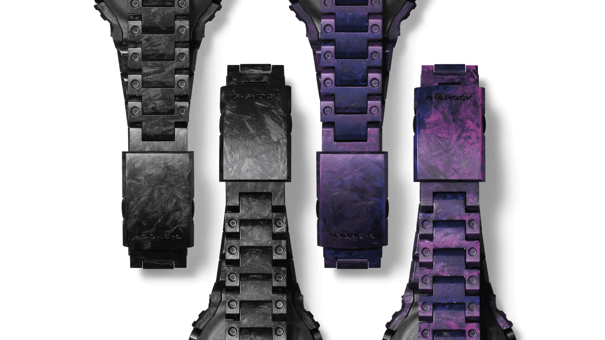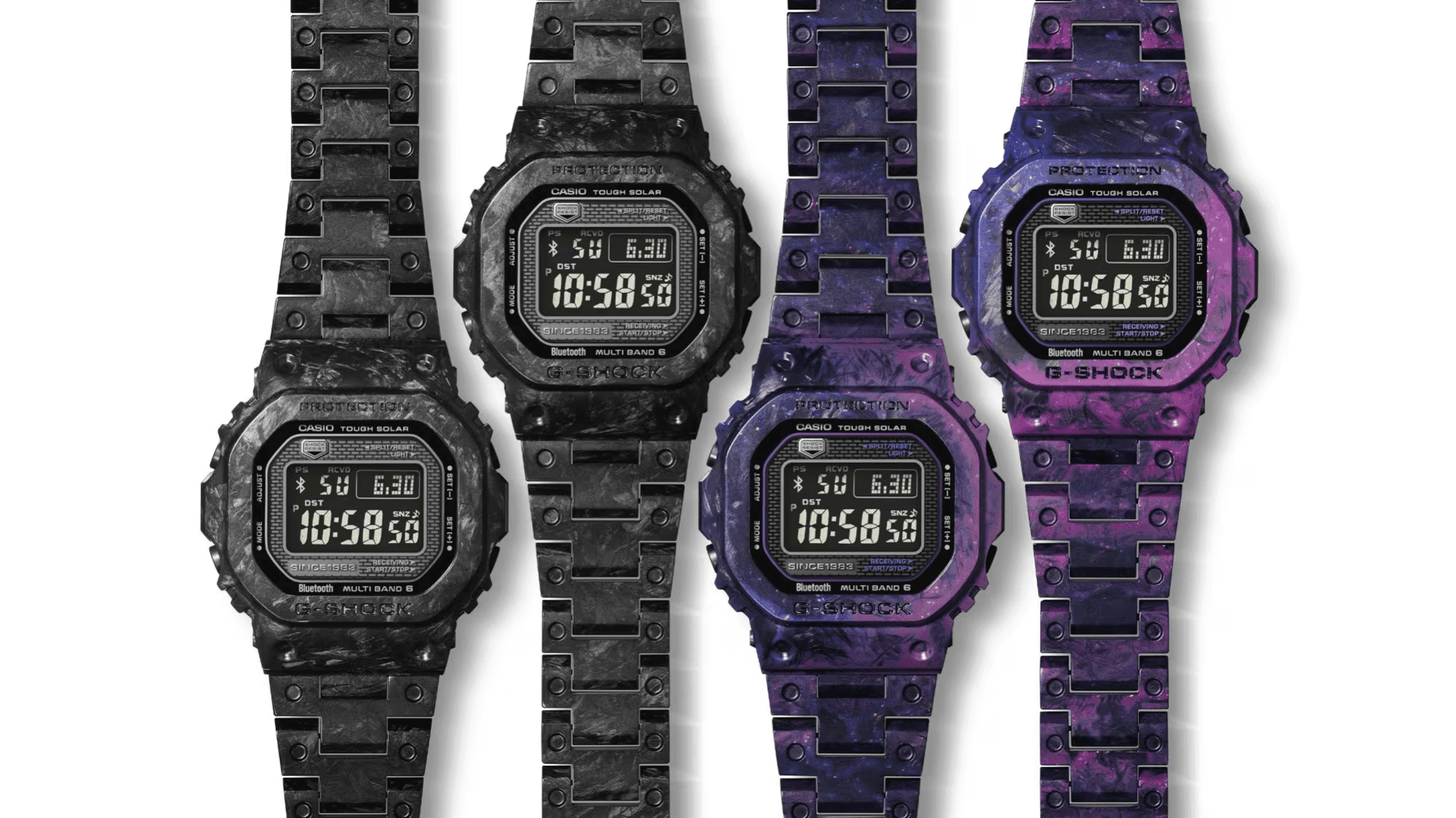 Inspired by the unique textural look of the forged carbon used for the bezel and band, the color schemes evoke the Milky Way’s magnificent band of hazy light. Two color options are offered: the GCW-B5000UN-1 is clad in a pattern of mixed black and grey, while the GCW-B5000UN-6 combines black carbon fiber with blue and pink coloured resin and opal specks for a mysterious appearance.