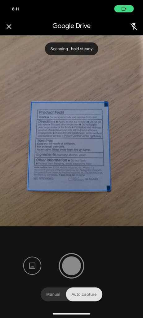 …εισιτήρια, συνταγές, λογαριασμούς κ.ο.κ από το χαρτί στην οθόνη πιο εύκολα. Με την επιλογή μιας τετράγωνης λειτουργίας στο New όπου υπάρχει το Scan, δεν ανοίγει η default camera app του κινητού αλλά ένα νέο viewfinder που γράφει Google Drive όπου υπάρχει και Αuto capture mode, αλλά και Manual.