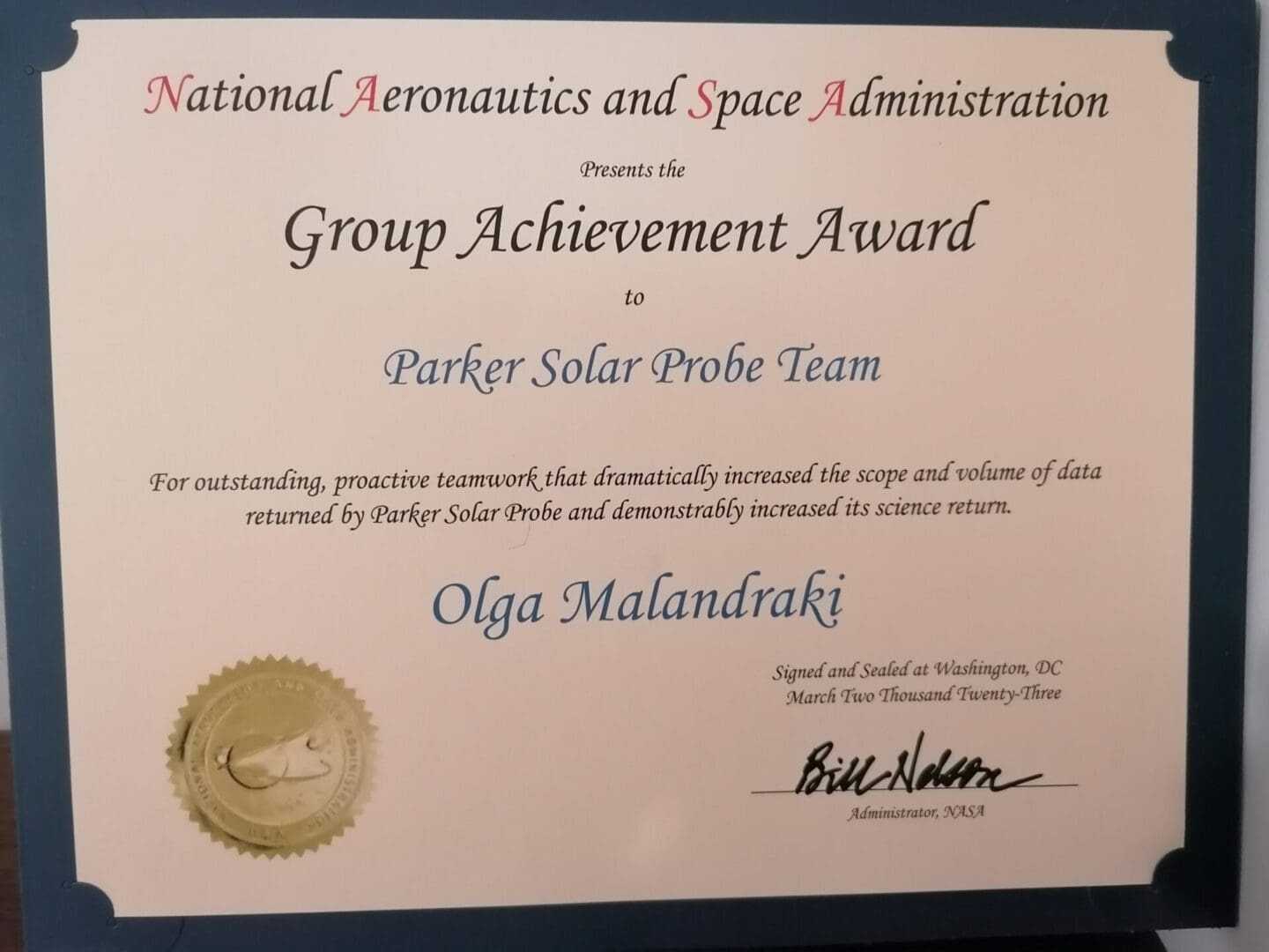 Η Ελληνίδα επικεφαλής της Επιχειρησιακής Μονάδας Διαστημικού Καιρού του ΕΑΑ επέστρεψε με ένα σημαντικό βραβείο της NASA το Group Achievement Award για την δουλειά της με την Parker Solar Probe Team που έχει αναλάβει να αναλύει δεδομένα από τον εξελιγμένο αυτό διαστημικό βολιστήρα. «Το Team Achievement Award δόθηκε στους επιστήμονες της αποστολής Parker Solar Probe ως αναγνώριση των προσπαθειών της ομάδας να δημιουργήσει και να λειτουργήσει την πρώτη “touch the Sun” αποστολή της Ανθρωπότητας. Είμαστε ενθουσιασμένοι που συμμετέχουμε», τόνισε η κα. Μαλανδράκη που περιέγραψε και τους στόχους που έχουν τεθεί από τις αποστολές Parker Solar Probe και το Solar Orbiter. «Η ανθρωπότητα γνωρίζει, με βάση τις αποστολές που έχουμε πετάξει, δεδομένα για τον ήλιο μέχρι στο λεγόμενο σημείο L1. Το L1 είναι ακριβώς μπροστά από την Γη, ένα σημείο που ισορροπείται η βαρυτική δύναμη του Ήλιου με αυτή της Γης. Είναι ακριβώς μπροστά από την μύτη της μαγνητόσφαιρας, έξω λοιπόν από το μαγνητικό πεδίο της Γης, και εκεί πέρα βρίσκονται τα διαστημόπλοια. Και τη δεκαετία του 1980 είχαν φύγει για εκεί τα διαστημόπλοια HELIOS – μια συνεργασία της Γερμανίας με τη ΝASA – τα οποία πήγαν στο ένα τρίτο της απόστασης, δεν είχαν όμως τα πειράματα της τεχνολογίας που έχουμε σήμερα. Επομένως, το κομμάτι του διαστήματος μεταξύ Ηλίου – Γης, η εσωτερική ηλιόσφαιρα όπως λέγεται, ήταν ένα μυστήριο…», εξήγησε η Ελληνίδα ερευνήτρια Φυσικής Διαστήματος.