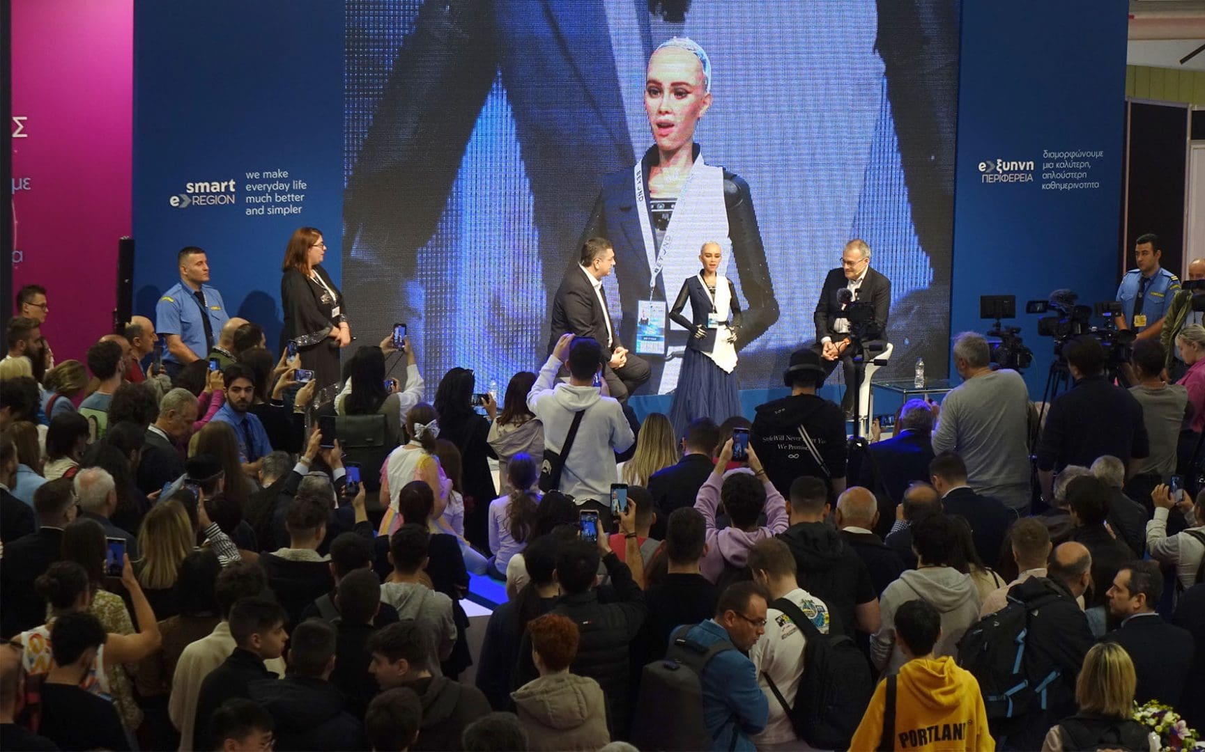 Η Sophia εμφανίστηκε στο σταντ της Περιφέρειας Κεντρικής Μακεδονίας και συζήτησε με τον Περιφερειάρχη, κ. Απόστολο Τζιτζικώστα και τον διοικητή της Εθνικής Αρχής Κυβερνοασφάλειας, κ. Μιχάλη Μπλέτσα, απαντώντας παράλληλα και σε ερωτήσεις του κοινού για τη Θεσσαλονίκη, τους ανθρώπους της, αλλά και την τεχνητή νοημοσύνη και τον αντίκτυπό της.