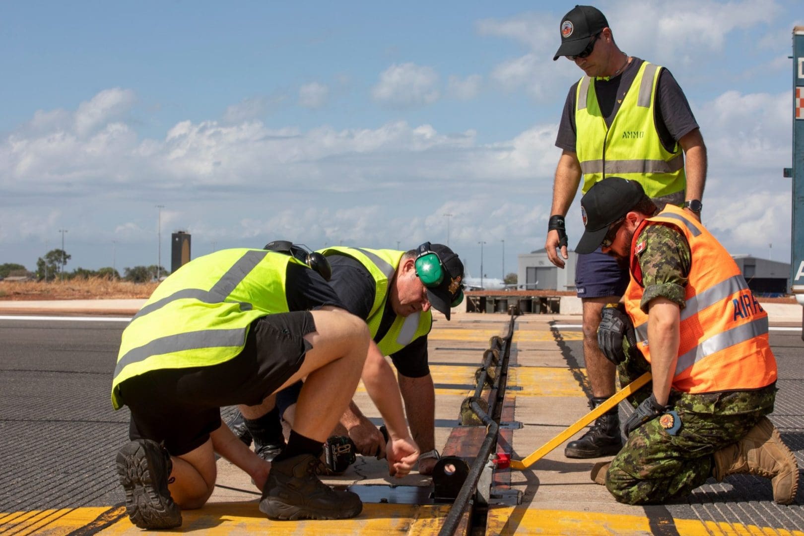 Royal Australian Air Force Ground Support Equipment Technicians from No. 13 Squadron and Royal Canadian Air Force Aircraft Arrestor Systems Technician, Corporal Evan Barbeau from 8 Wing Trenton, check a BAK arrestor arm at RAAF Base Darwin, Northern Territory, during Exercise Pitch Black 2022. *** Local Caption *** Exercise Pitch Black is the Royal Australian Air Force�s largest and most complex Large Force Employment exercise. Pitch Black 2022 is being conducted at RAAF Bases Darwin, Tindal and Amberley
