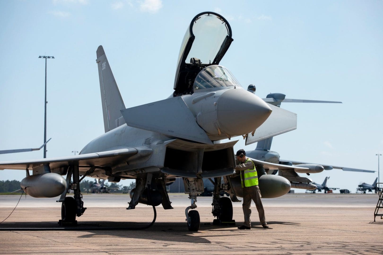 A Royal Air Force maintainer prepares a Eurofighter Typhoon for take-off during Exercise Pitch Black 2022, at RAAF Base Darwin. *** Local Caption *** Exercise Pitch Black is the Royal Australian Air Force�s largest and most complex Large Force Employment exercise. Pitch Black 2022 is being conducted at RAAF Bases Darwin, Tindal and Amberley from 19 August to 08 September 22. This year�s exercise will host up to 2500 personnel and around 100 aircraft from 17 participating nations from around the globe.
