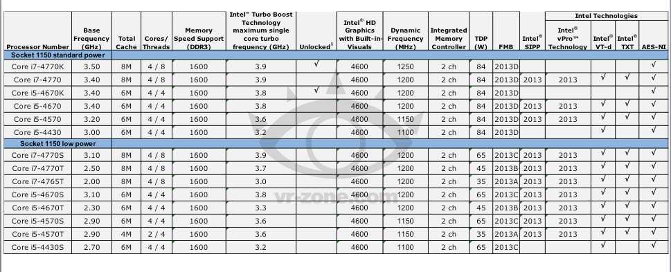 Ναυαρχίδα θα είναι ένας Core i7-4770K… Στο δε VR-Zone κατάφεραν να βρουν όλη τη σειρά των 22nm Haswell desktop επεξεργαστών. Αρχικά θα είχαμε 14 CPUs σε Core i7 και Core i5 ενώ θα έχουμε νέα CPU θύρα LGA 1150 με τις Lynx Point chipset motherboards. Θα υπάρχουν και κανονικής ισχύος SKUs και οκτώ μοντέλα που θα έχουν low power SKUs. Κορυφαίος ο Intel Core i7-4770K με 3.50GHz base clock και 4 πυρήνες και 8 threads, όπως και 3.9GHz boost με 8MB cache. Για γραφικά on-die το Ιntel HD 4600 με...