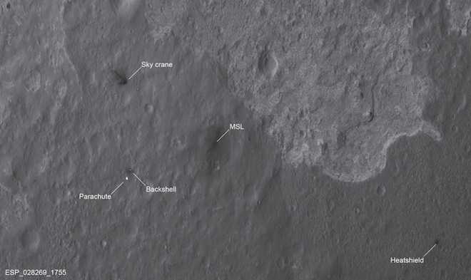 Μια συγκλονιστική εικόνα του NASA Curiosity rover που… κάθεται στην επιφάνεια του πλανήτη Άρη. Η εικόνα είναι του Mars Reconnaissance Orbiter HiRISE δορυφόρου. Και με την κάμερα απεικονίζει κάθε εξάρτημα του σκάφους από ψηλά! Αν κανείς κάνει ζουμ θα δει μαύρες γραμμές από τους πυραύλους και το αλεξίπτωτο. Στα δεξιά η ασπίδα θερμότητας που προστάτεψε το σκάφος στην είσοδο του, 4000 πόδια από το Curiosity. Συγκλονιστικό… Το αλεξίπτωτο…